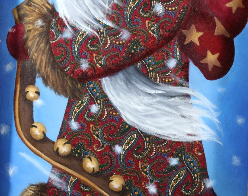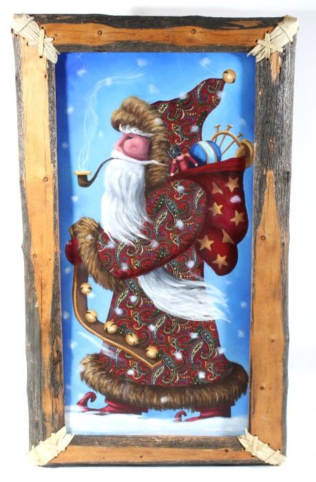 For your consideration in this lot we have a original rendition showing Santa Claus. The piece was painted by Montana artist Doreen Miller. The painting shows the image of Santa in a ornate red coat with brown fur trim. Santa is depicted as smoking a pipe while carrying a strip of sleigh bells and a sack of toys on his back. The painting is set in a rustic frame made of real edge wood with rawhide covering the joints. The piece is in good condition and the frame measures 20" wide by 35" tall.