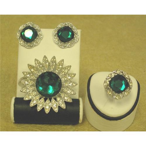 Wonderful parure includes ring, earrings and brooch - marked SARAH COV. Brooch measures 2" in diameter, earrings and ring 1". Ring is adjustable. n great condition with a few slightly discolored stones.
