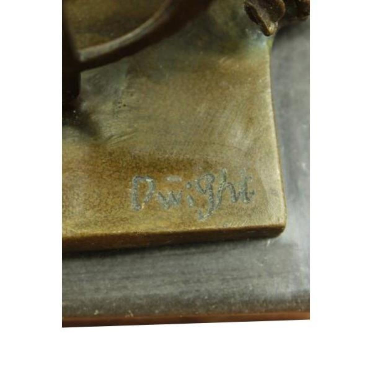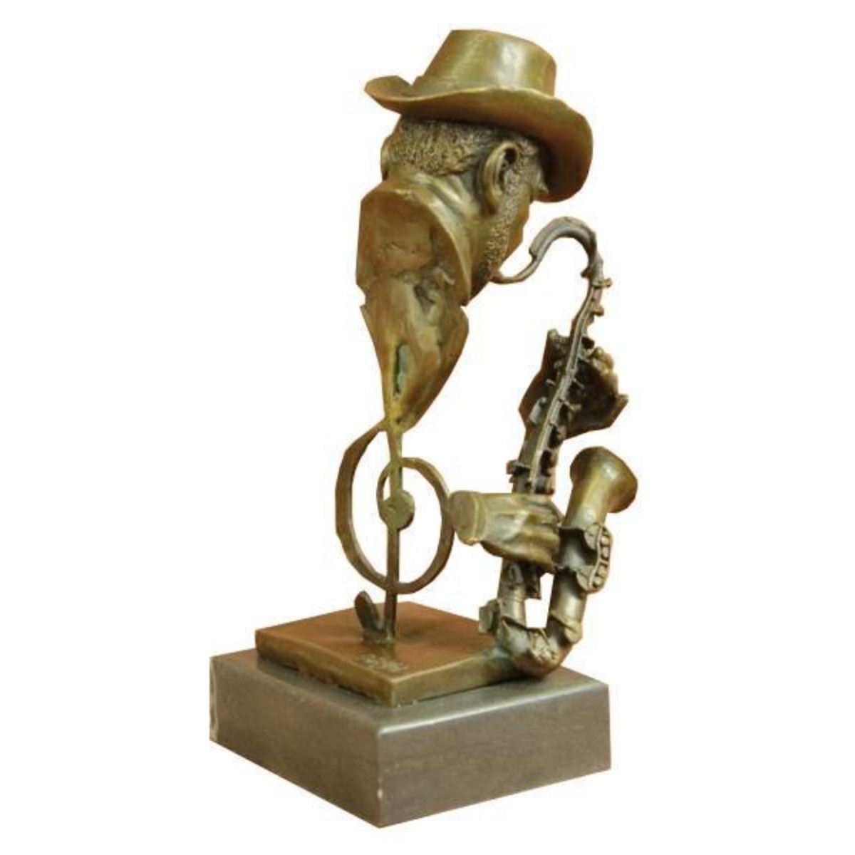 Condition: this sculpture is in perfect condition. Bronze dimensions with marble base:height 10" x width 5" marble dimensions: 4" x 4" height without base: 9" weight : 7 lbs This gorgeous 100% real figural decoration of bust of a black musician playing the saxophone figurine has the finest details and highest quality you will find anywhere! The craftsmanship of this lovely saxophone player figurine is truly remarkable and this masterwork fills any room with pure joy of classic blue jazz. He was molded using the age-old method of lost-wax casting and stained with a brown patina for preservation. He stands upon a bronze plinth that is mounted to a black marble base and is signed by artist Dwight