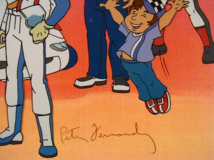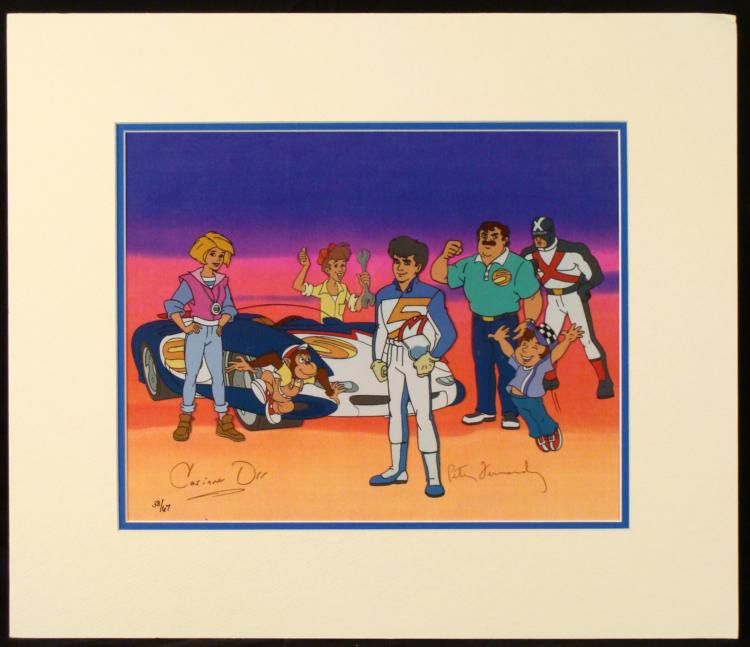 Speed Racer debuted in 1967, igniting the Japanese anime cartoon craze in the United States. Though it was originally titled Mach GoGoGo, the English-dubbed series Speed Racer soon became a classic. Speed Racer follows the races and adventures of a young driver named Speed. Using his ultimate driving machine, the Mach 5, Speed not only competes in races, but many times defeats evil forces and saves his own skin. Many fans remember the quick-cut action and fast-moving lips of the animation. * * Here, Speed's entire crew is getting ready for his next big race... * * Medium: Sericel with a printed background * Cel size: 10 1/2"x 12 1/2" * Matte size: 10 1/4" x 12 1/4" * Signatures: Corinne Orr (Voice of Trixie) and Peter Fernandez (Voice of Speed Racer) in black pen * Edition: 38/67 * Condition:Excellent * The sericel is double matted and is ready to be framed. It comes in a protective sleeve *