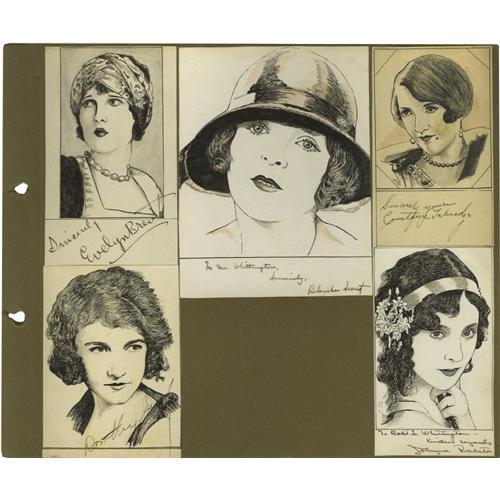 <B>Signed Sketches of Cecil B. DeMille, Maurice Chevalier, Dorothy Gish, Ramon Navarro, Evelyn Brent, Mary Philbin and More!</B></I> This charming collection of Robert Whittington sketches presents image of and autographs from some of the giants of late 1920/early 1930s Hollywood: lordly Cecil B. DeMille (who'd recently directed <I>The King of Kings</B></I>), dapper Maurice Chevalier (who'd just joined Paramount Studios), demure Dorothy Gish (<I>Nell Gwynne</B></I>), dashing Ramon Navarro (<I>Ben-Hur</B></I>), vampy Evelyn Brent (<I>Underworld</B></I>), maidenly Mary Philbin (<I>The Phantom of the the Opera</B></I>) - also Blanche Sweet, Constance Talmadge, Jobyna Ralston, Alyce Mills and Gracie Fields. Wonderful sketches and a splendid batch of vintage autographs in Excellent condition.<BR><BR><b>Shipping:</b> Flat Material, Small (<a target="_blank" href="http://www.heritageauctions.com/common/shipping.php">view shipping information</a>)