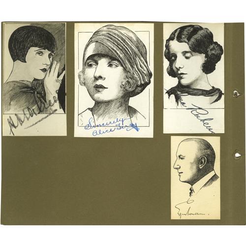<B>Signed Sketches of Pearl White, Mary Astor, Dolores Costello, Sophie Tucker, Alma Rubens, Carmel Myers and More!</B></I> The Silent Screen offered wonderful faces,and here's a bevy of them, sketched by Robert Whittington and signed to the artist by the luminaries themselves: Pearl White (star of <I>The Perils of Pauline,</B></I> who enjoyed anonymity in public by removing her blonde wig), Mary Astor (John Barrymore's leading lady in <I>Don Juan,</B></I> long before tempting Bogart in <I>The Maltese Falcon</B></I>), Dolores Costello (whom Barrymore called "the most preposterously lovely creature in the world," and married), Sophie Tucker (the legendary inger), Alma Rubens (dead at 33, a drug addict), Carmel Myers (the voluptuous Iras of the 1925 <I>Ben-Hur</B></I>) - plus Johnny Hines, Thomas Meighan, Antonio Moreno, Pauline Starke, Alice Terry, May Allison, Gertrude Astor, and Blanche Mahaffey. Stylish drawings and clean vintage autographs! Excellent condition.<BR><BR><b>Shipping:</b> Flat Material, Small (<a target="_blank" href="http://www.heritageauctions.com/common/shipping.php">view shipping information</a>)