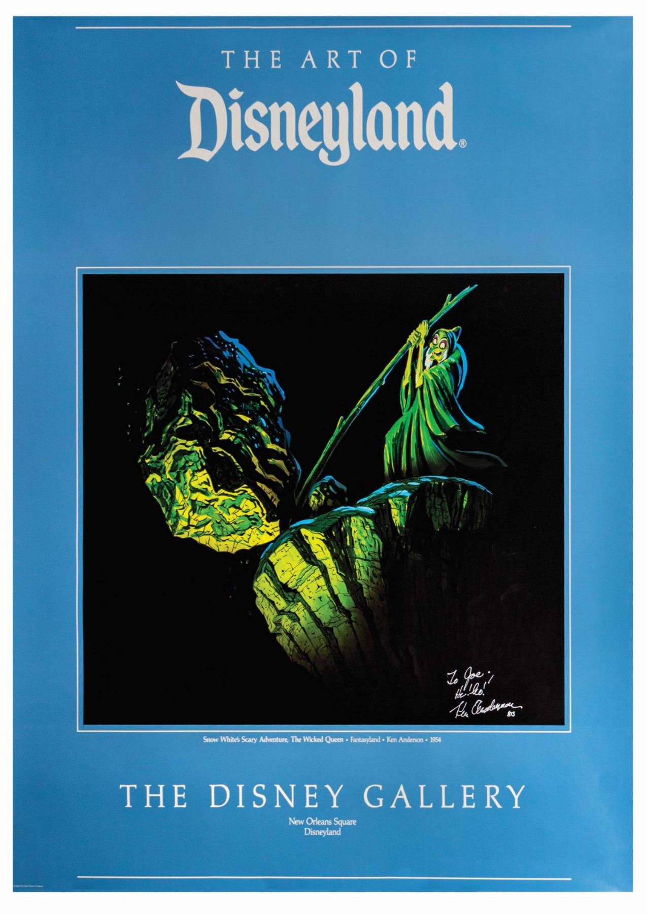 (Disneyland, 1988) A large print of a concept design by Imagineer Ken Anderson of the Wicked Queen in Snow White's Scary Adventure. The print was offered as part of the Disney Gallery's The Art of Disneyland series. This print was signed and personalized "to Joe" by Anderson at a Disney Gallery event. Measuring 32"x26" this poster is in very good condition and has been rolled.