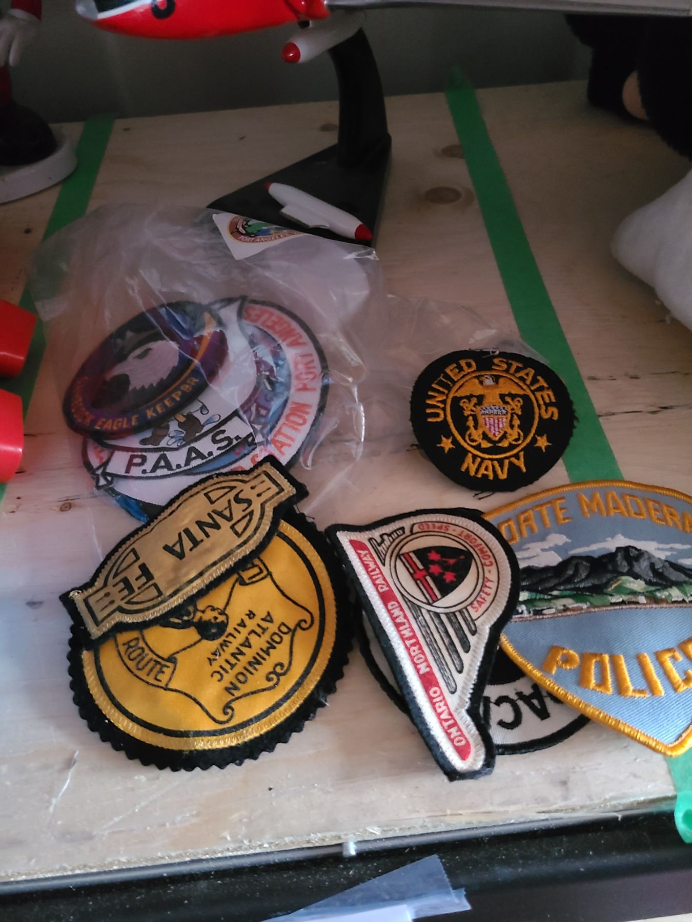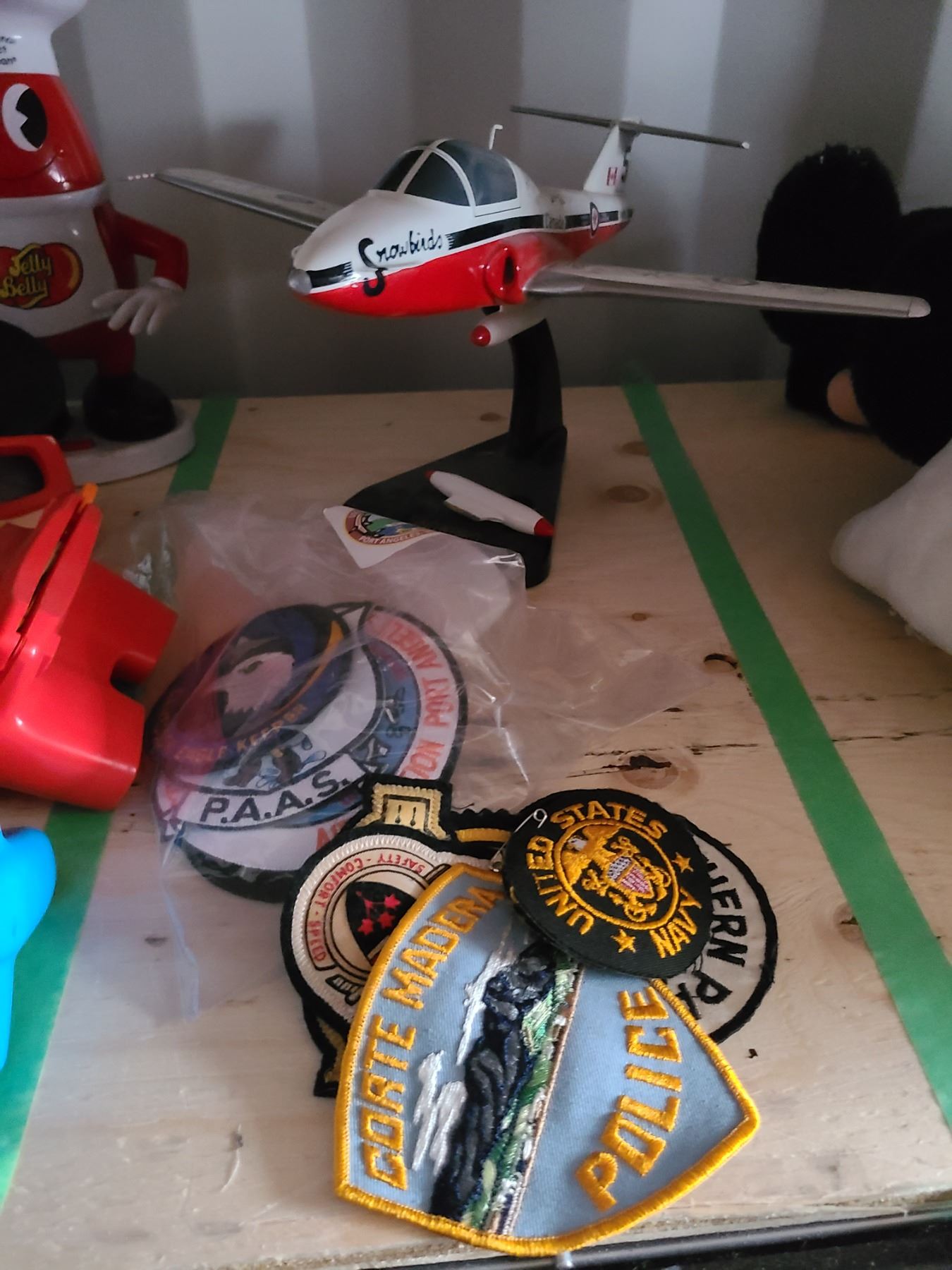 Signed snowbird plane, colour jet needs to be glued back on. Various badges. Pickup at 9 am