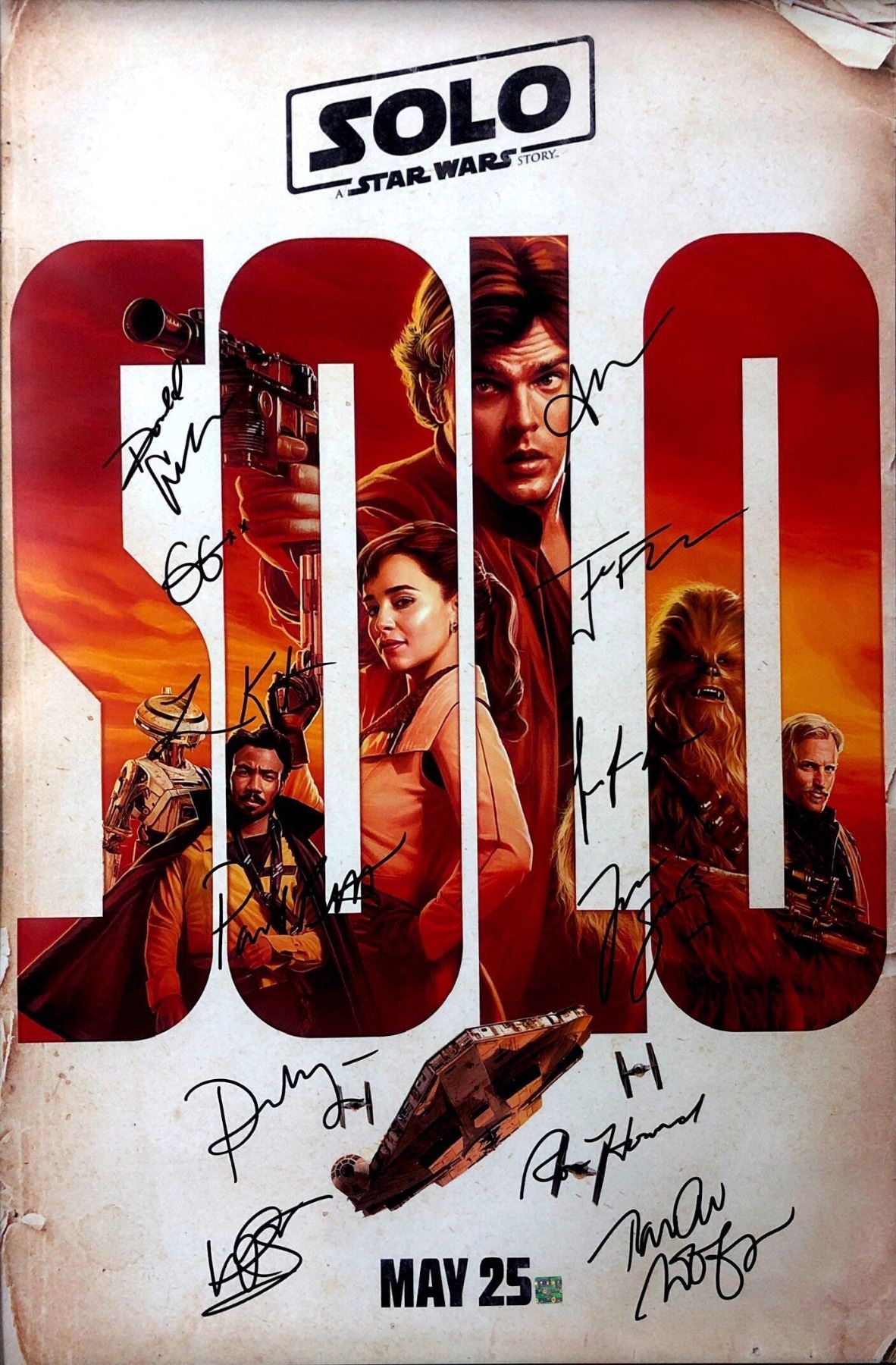 Signed By : Alden Ehrenreich, Joonas Suotamo, Emilia Clarke, Donald Glover, Thandie Newton, Paul Bettany, Woody Harrelson, Jon Favreau, Ron Howard, and George Lucas