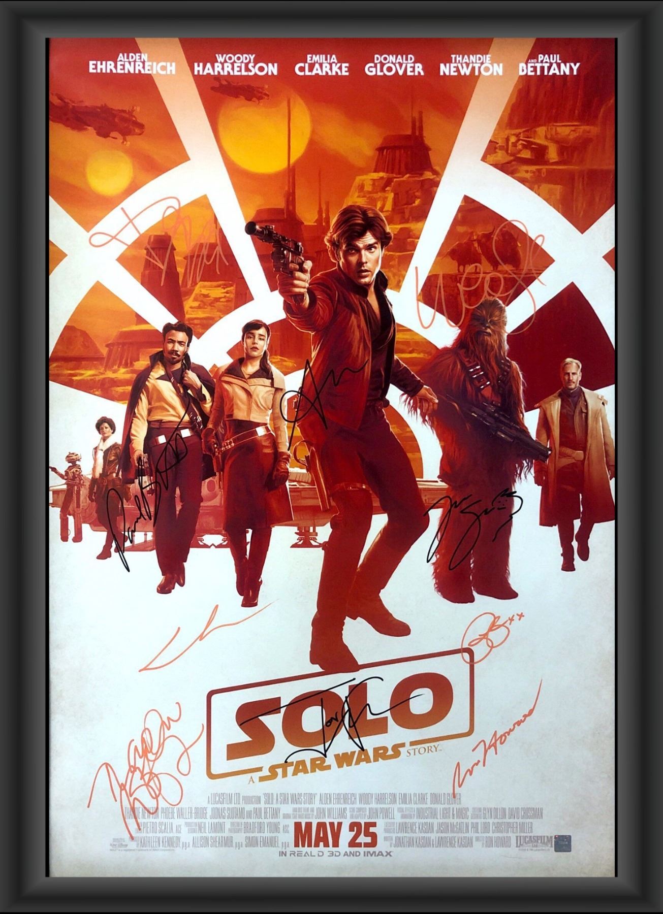 Autographed by Alden Ehrenreich, Joonas Suotamo, Emilia Clarke, Donald Glover, Thandie Newton, Paul Bettany, Woody Harrelson, Jon Favreau, Ron Howard, and George Lucas