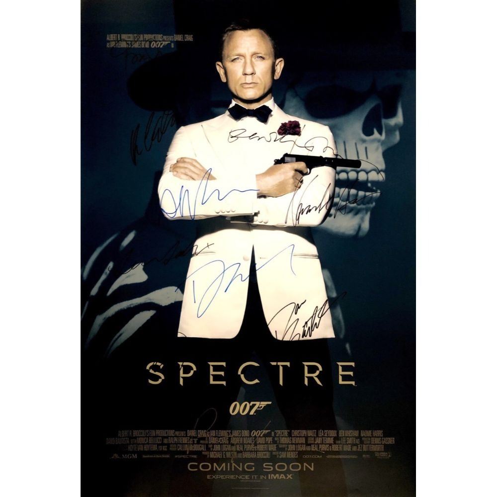 Signed by Daniel Craig, Ralph Fiennes, Christoph Waltz, Monica Bellucci, Dave Bautista, Naomie Harris, Lea Seydoux, Ben Whishaw, Rory Kinnear, Andrew Scott