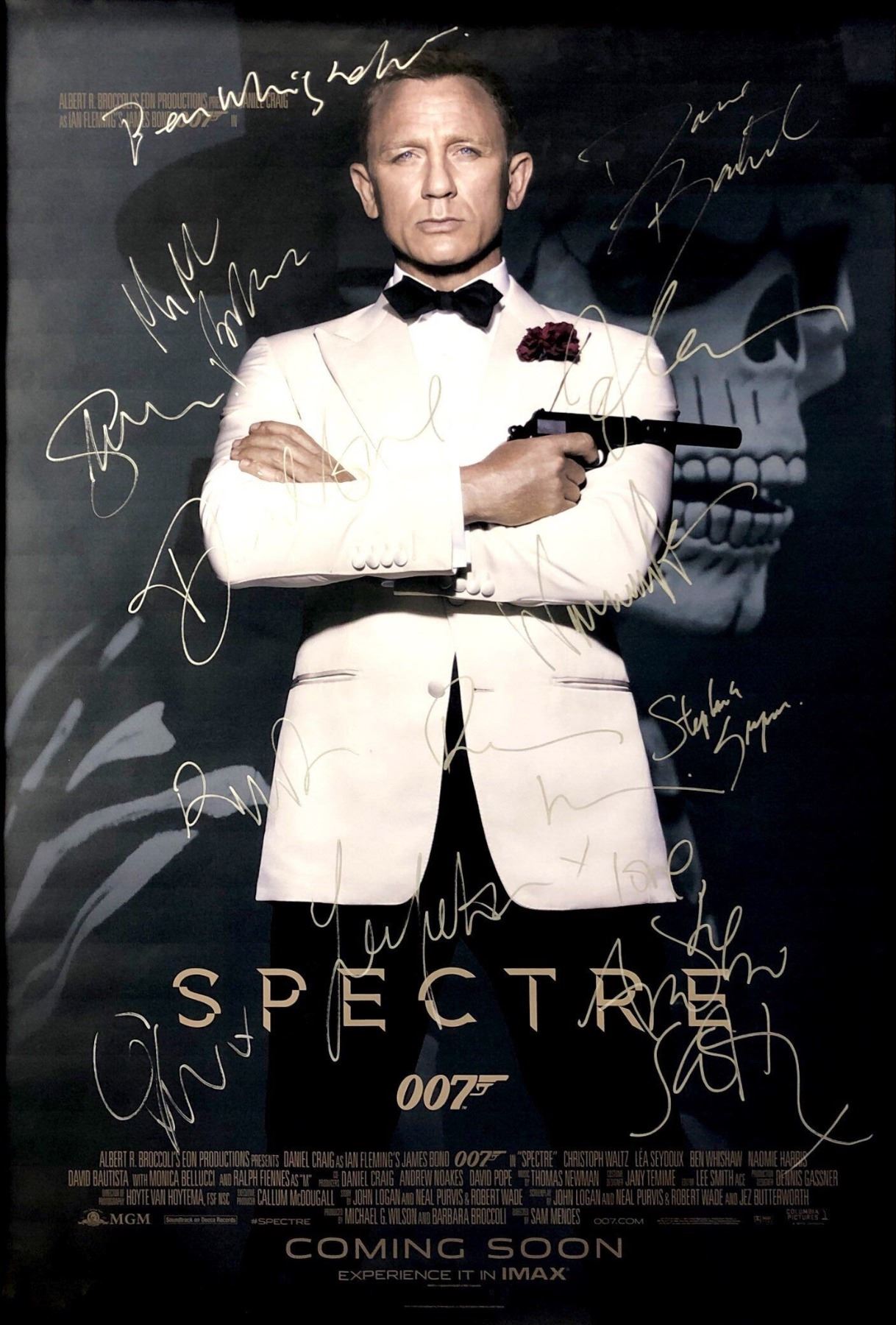 Signed by Daniel Craig, Monica Bellucci, Stephanie Sigman, Lea Seydoux, Dave Bautista, Ralph Fiennes, Christoph Waltz, Naomie Harris, Andrew Scott, Ben Whishaw, Rory Kinnear, Jesper Christensen, Dir Sam Mendes