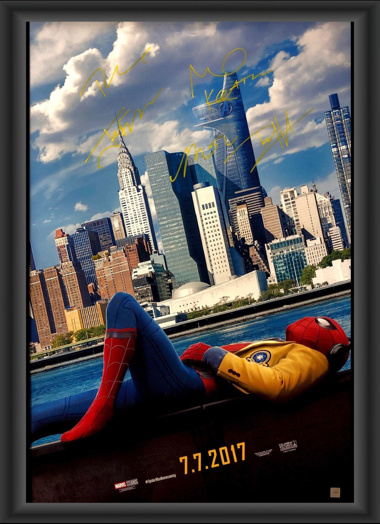 Signed by Tom Holland (Spider-Man), Robert Downey Jr (Iron Man), Marisa Tomei (Aunt May), Jon Favreau (Happy Hogan) and Michael Keaton (The Vulture)
