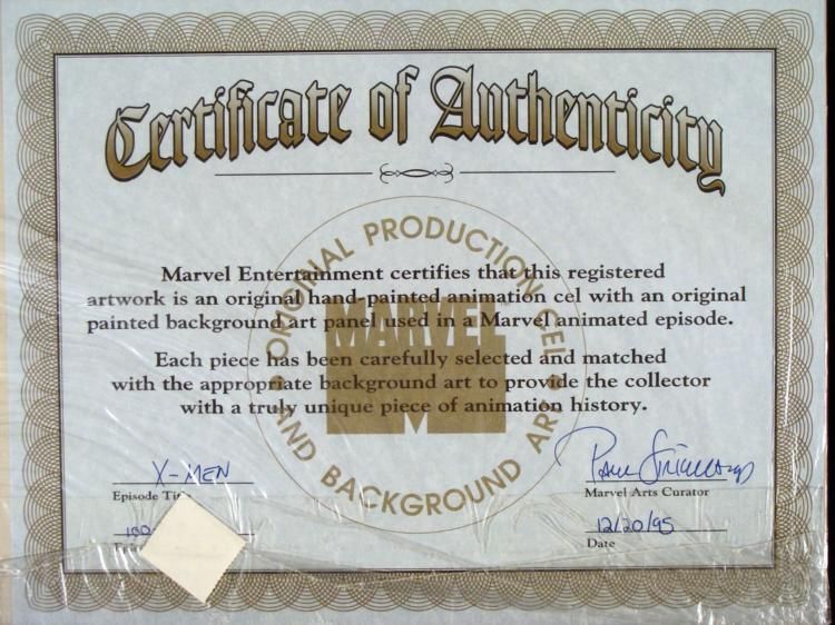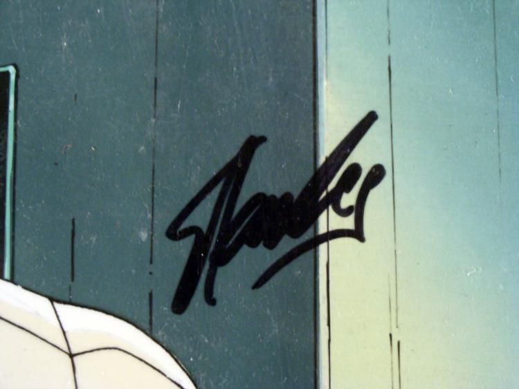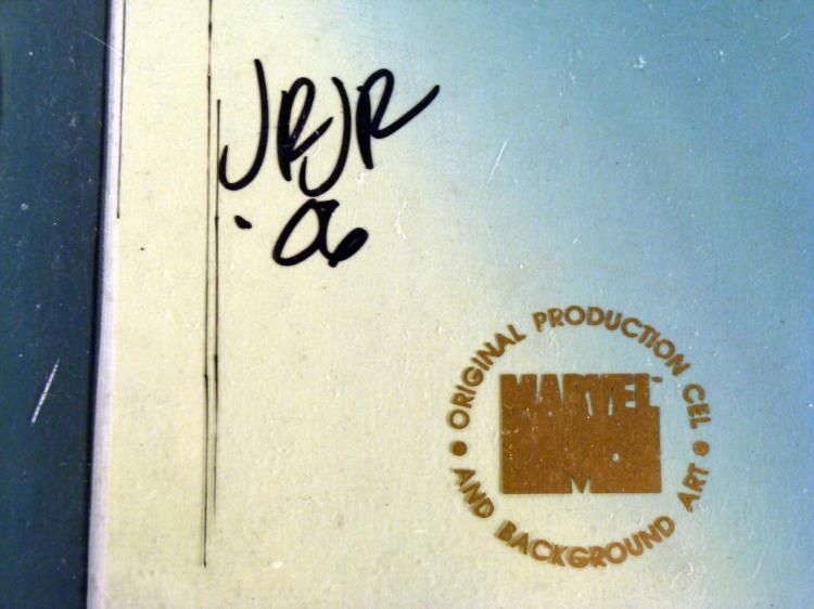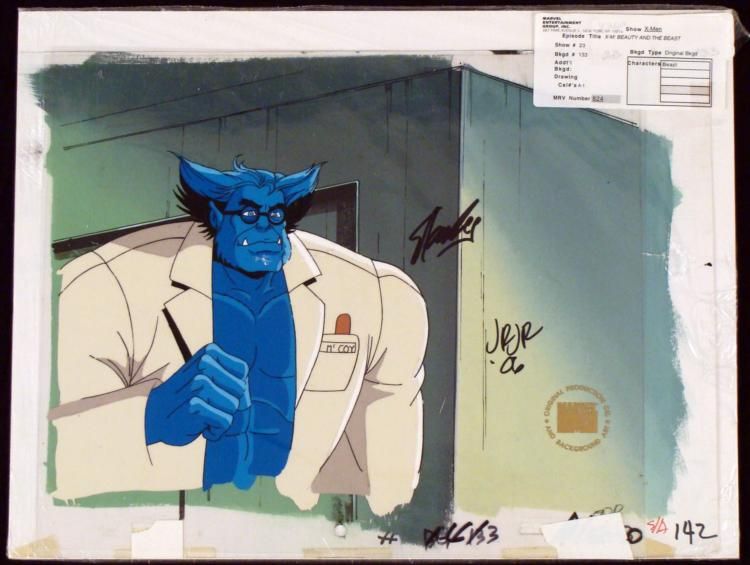 This is an original signed production cel and background from the hit series X-Men. Stan Lee signature is located on the right of cel in black sharpie. Also there is a signature from John Romita, Jr. (JRJR) dated '06 on the right side of the cel. * * * * Under a cloud of increasing anti-mutant sentiment, Professor Xavier creates a haven at his Westchester mansion to train young mutants to use their powers for the benefit of humanity, and to prove mutants can be heroes. Xavier recruited Cyclops, Iceman, Angel, * Beast and Jean Grey calling them "X-Men" because they possessed the "x-gene", an ability normal humans lacked. Early issues introduced the team's arch enemy, Magneto and his Brotherhood of Evil Mutants, who would later battle the X-Men for years. * * Beast is ripped * * * * * Original Animated Cel & Production BackgroundMedium: Hand painted acetate celDetails: Animation notations and peg holes * * Overall Size of the Cel: 10 1/2" x 12 1/2" * Overall Size of the background: 10 1/4" x 14 1/2" * Excellent Condition * This is an original hand-painted cel set-up used in the production of an episode of X-Men titled "Beauty and the Beast." Each one-of-a-kind set-up represents a slight change in position of the characters. When individually photographed and projected in rapid * succession, the images appear to move. * * To create production cels, the original animator's drawing is transferred onto an acetate cel (by hand-inking and/or photo copying). The cel is then hand-painted on the reverse side. The background accompanying this set-up is an original production background. * * * The cel and original background is ready to be matted and framed. The animators notations are located at the bottom of the cel and background. A Certificate of Authenticity from Marvel is on the back of * background. The Marvel Seal is located at the top right of the cel. The cel and background are in a protective sleeve. An information card about the episode is located at the top right of the protective sleeve. *