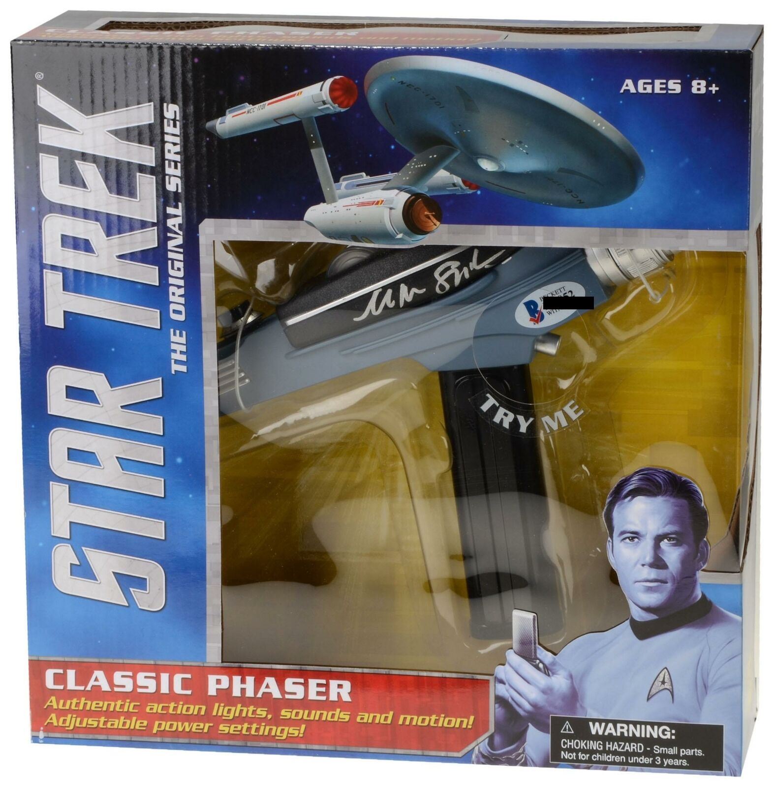 William Shatner signed phaser. This item does not really shoot. It is Beckett authenticated .This item comes with a Certificate of Authenticity from a third party authenticator. This Certification of Authenticity does not imply that the item will be certified by any other rival authentication companies. The accompanied certification is the only certification the auction company can confirm. These items are being sold as collectable pieces and there is no guarantee that this item can be resold on any online marketplace. Each of these companies has their own policies and politics.