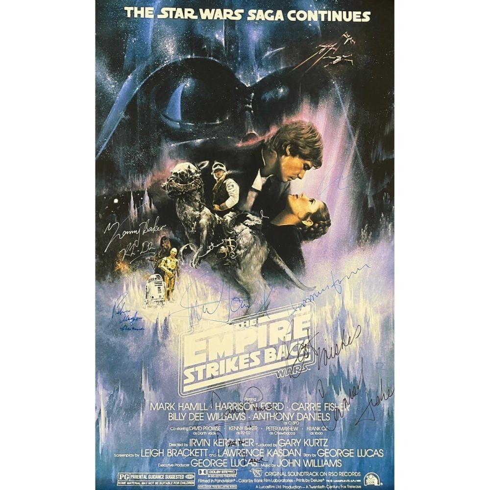 Signed by Carrie Fisher, Kenny Baker, Anthony Daniels, Billy Dee Williams, David Prowse, Peter Mayhew, Harrison ford, Mark Hamill