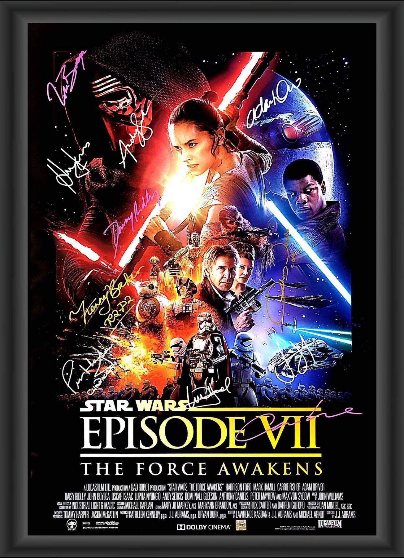 Signed by Mark Hamill, Harrison Ford, Daisy Ridley, John Boyega, Oscar Isaac, Peter Mayhew, Adam Driver, Andy Serkis, Anthony Daniels, Kenny Baker and JJ Abrams