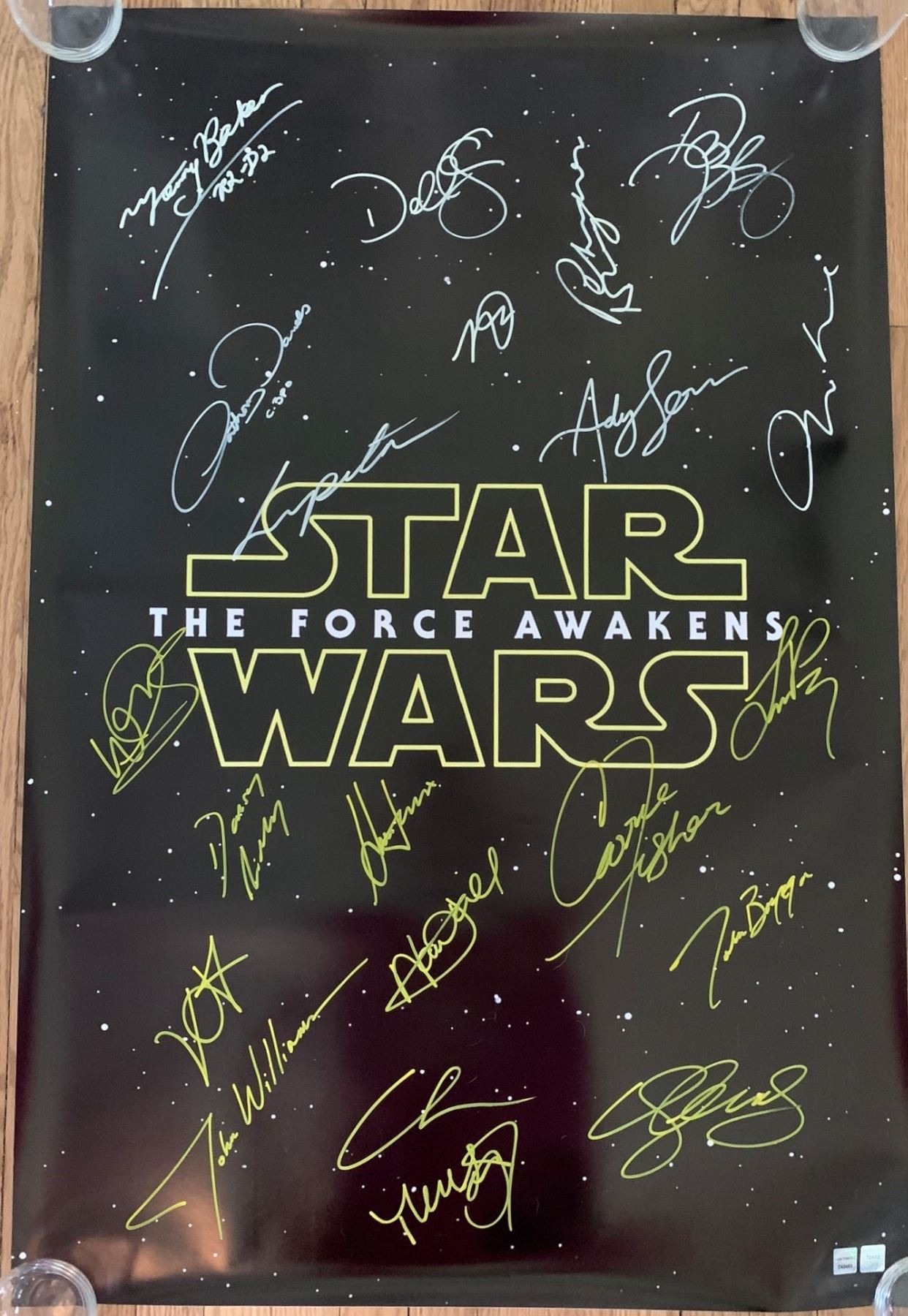 Signed by Mark Hamill, Harrison Ford, Carrie Fisher, Domhnall Gleeson, Daisy Ridley, John Boyega, Oscar Isaac, Peter Mayhew, Adam Driver, Andy Serkis, Anthony Daniels, Gwendoline Christie, Max von Sydow, Lupita Nyong'o, Kenny Baker, Warwick Davis, Greg Grunberg, Simon Pegg, John Williams, George Lucas, and JJ Abrams