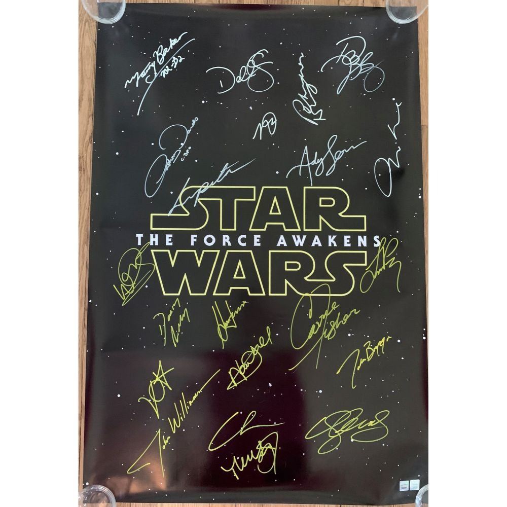 Signed by Mark Hamill, Harrison Ford, Carrie Fisher, Domhnall Gleeson, Daisy Ridley, John Boyega, Oscar Isaac, Peter Mayhew, Adam Driver, Andy Serkis, Anthony Daniels, Gwendoline Christie, Max von Sydow, Lupita Nyong'o, Kenny Baker, Warwick Davis, Greg Grunberg, Simon Pegg, John Williams, George Lucas, and JJ Abrams