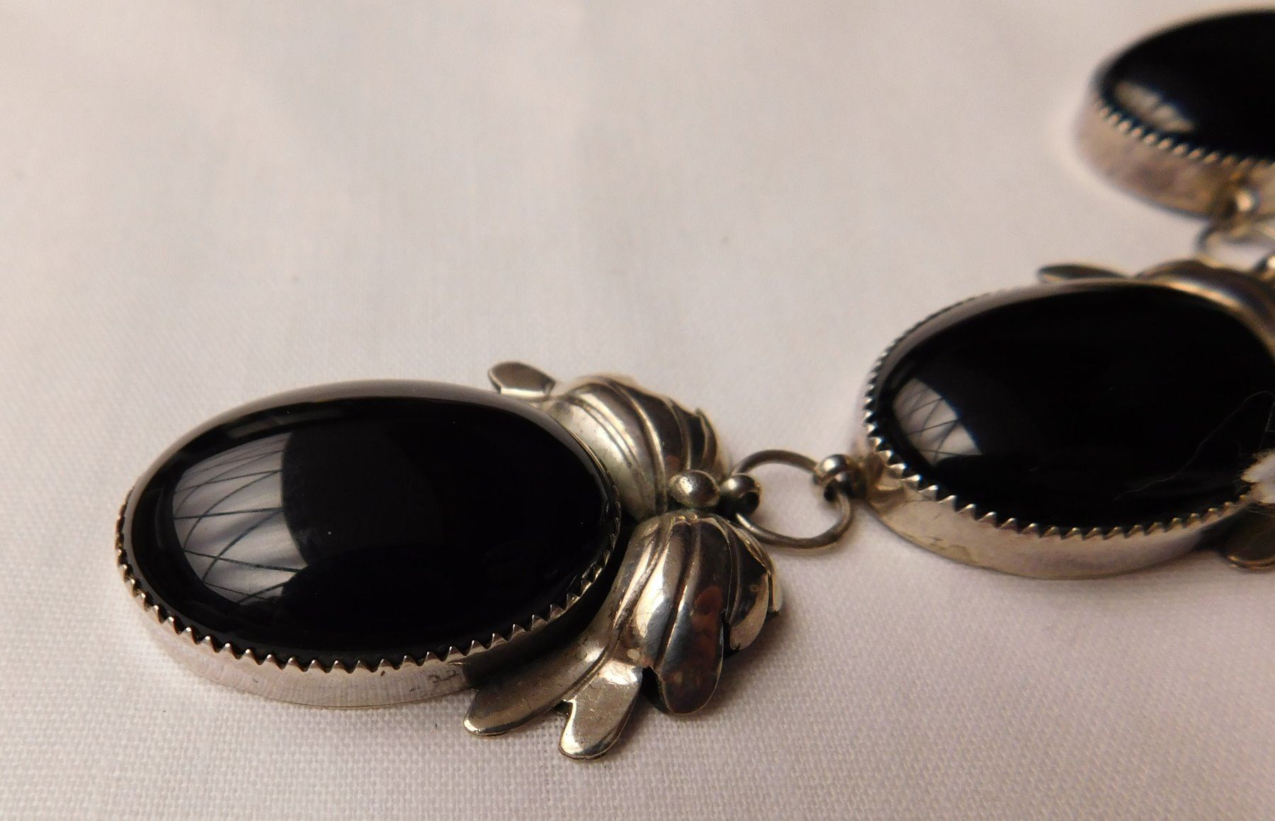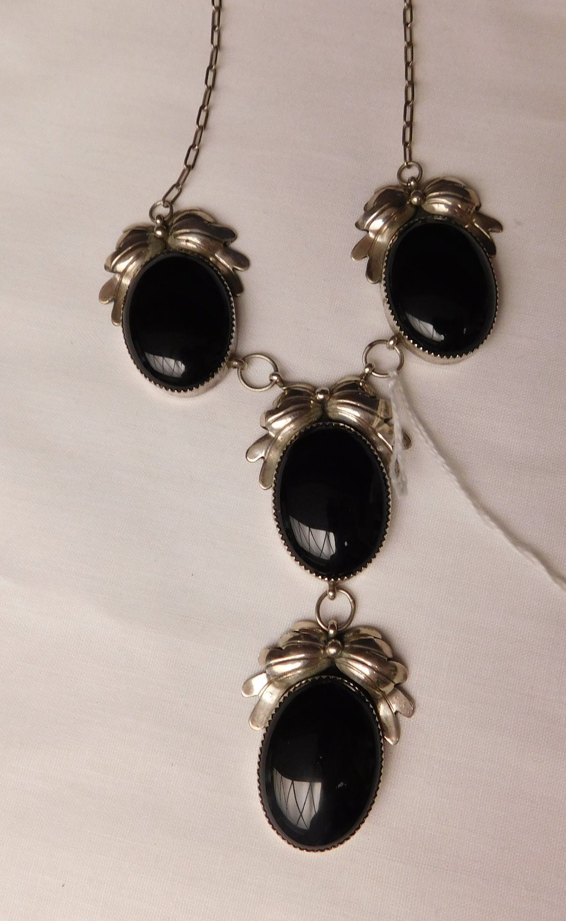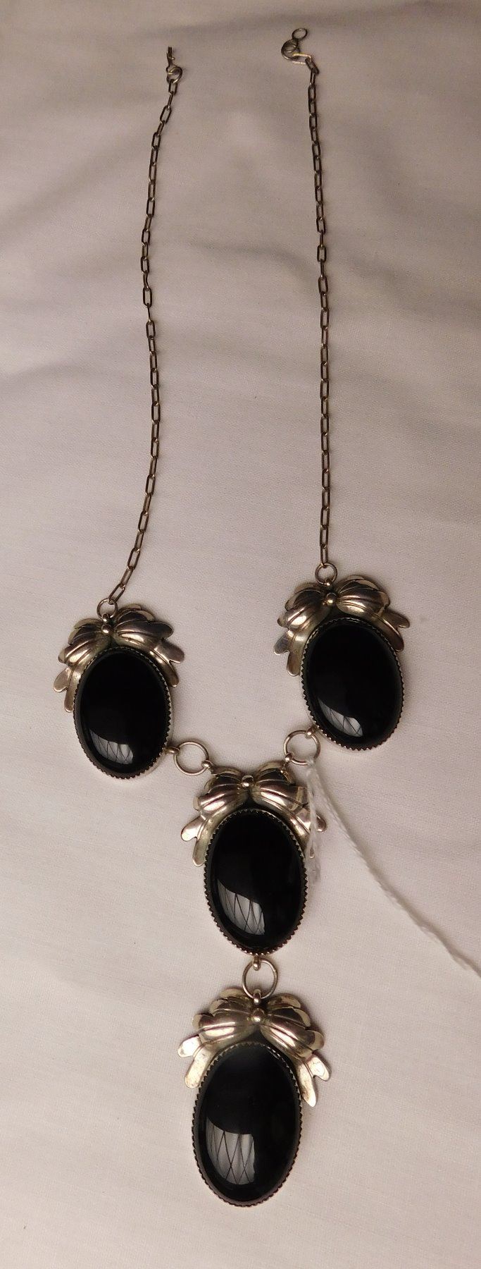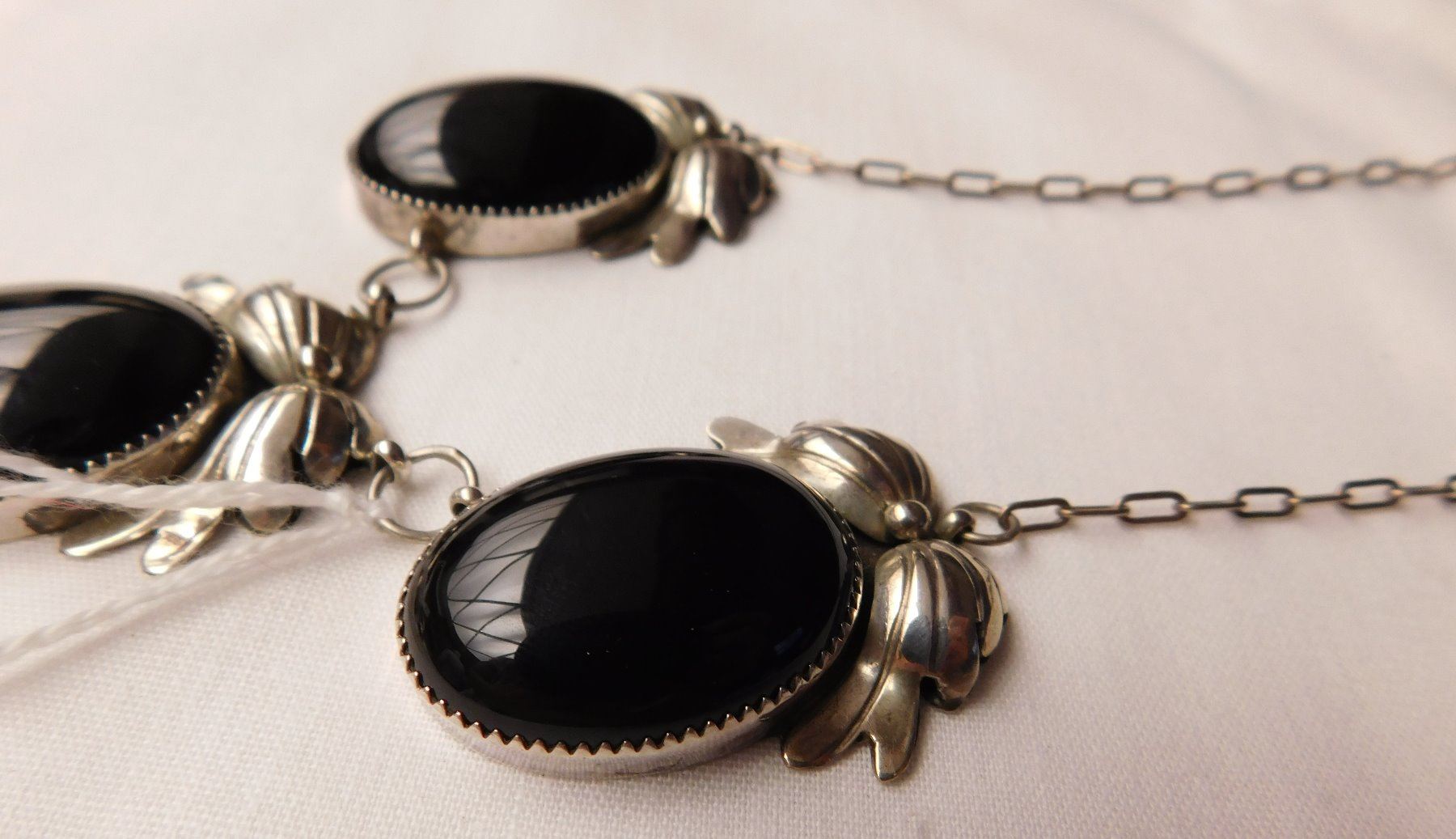 Signed Sterling Silver & Jet Necklace, c. 1950s. Made of sterling silver and jet, the item hangs 11 3/4" as worn, and weighs 53.4 grams. Condition: Good, pre-owned, see images. Shipping: $12.50 w/insurance and signature.
