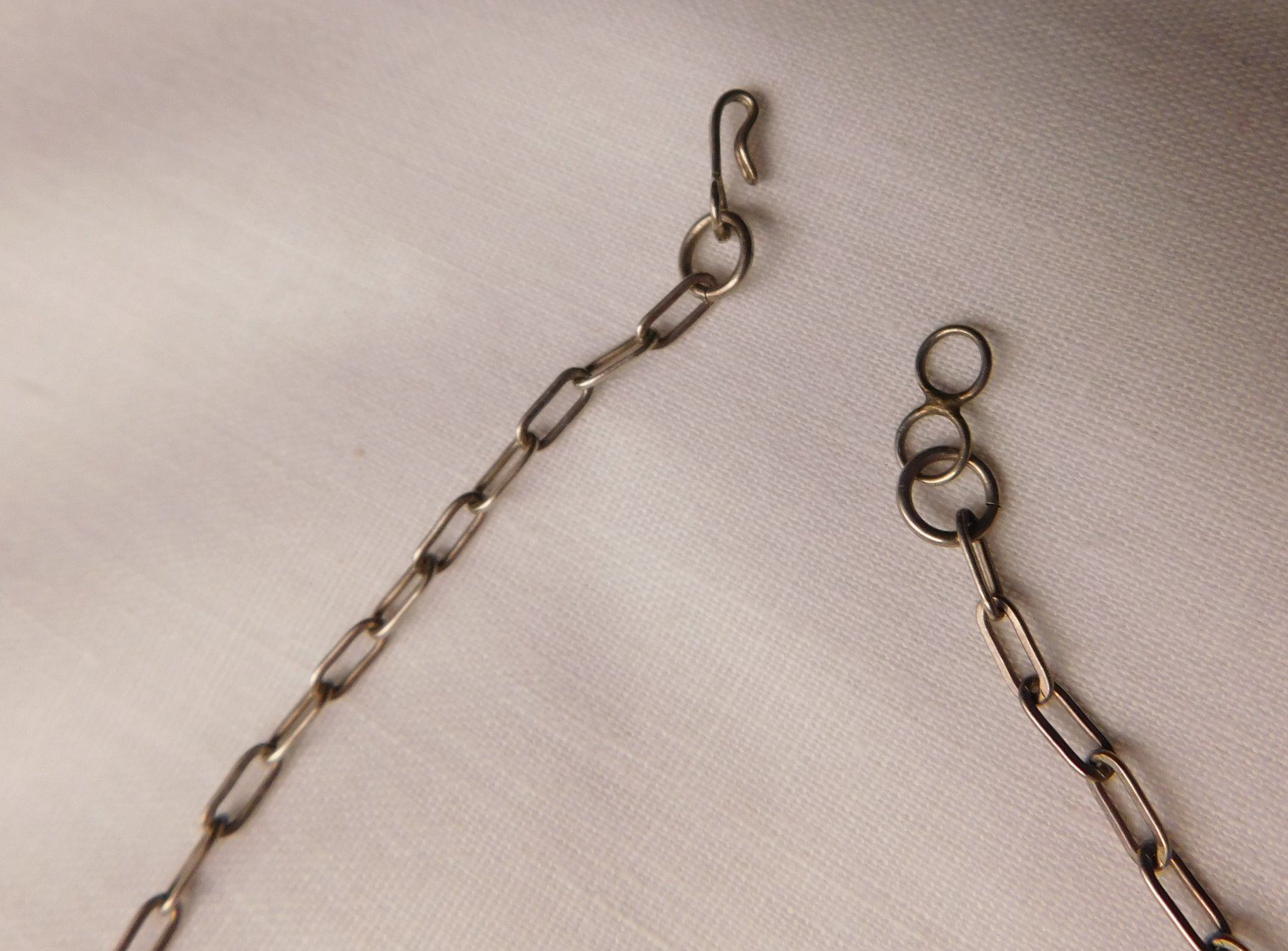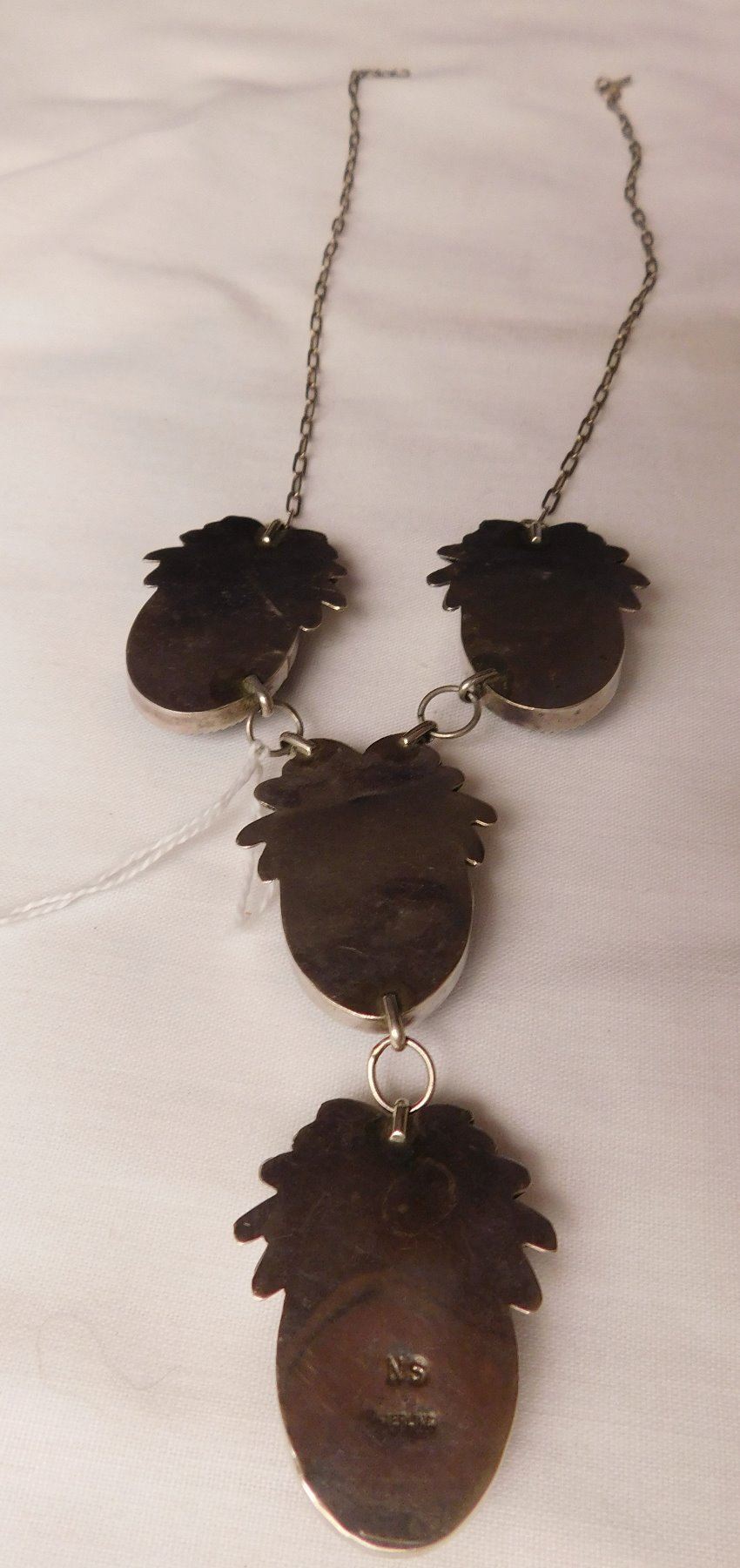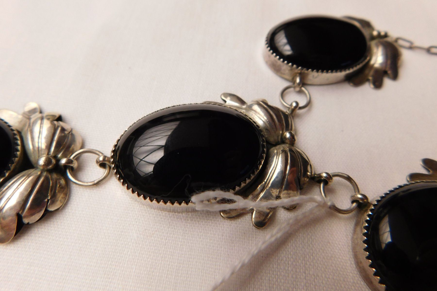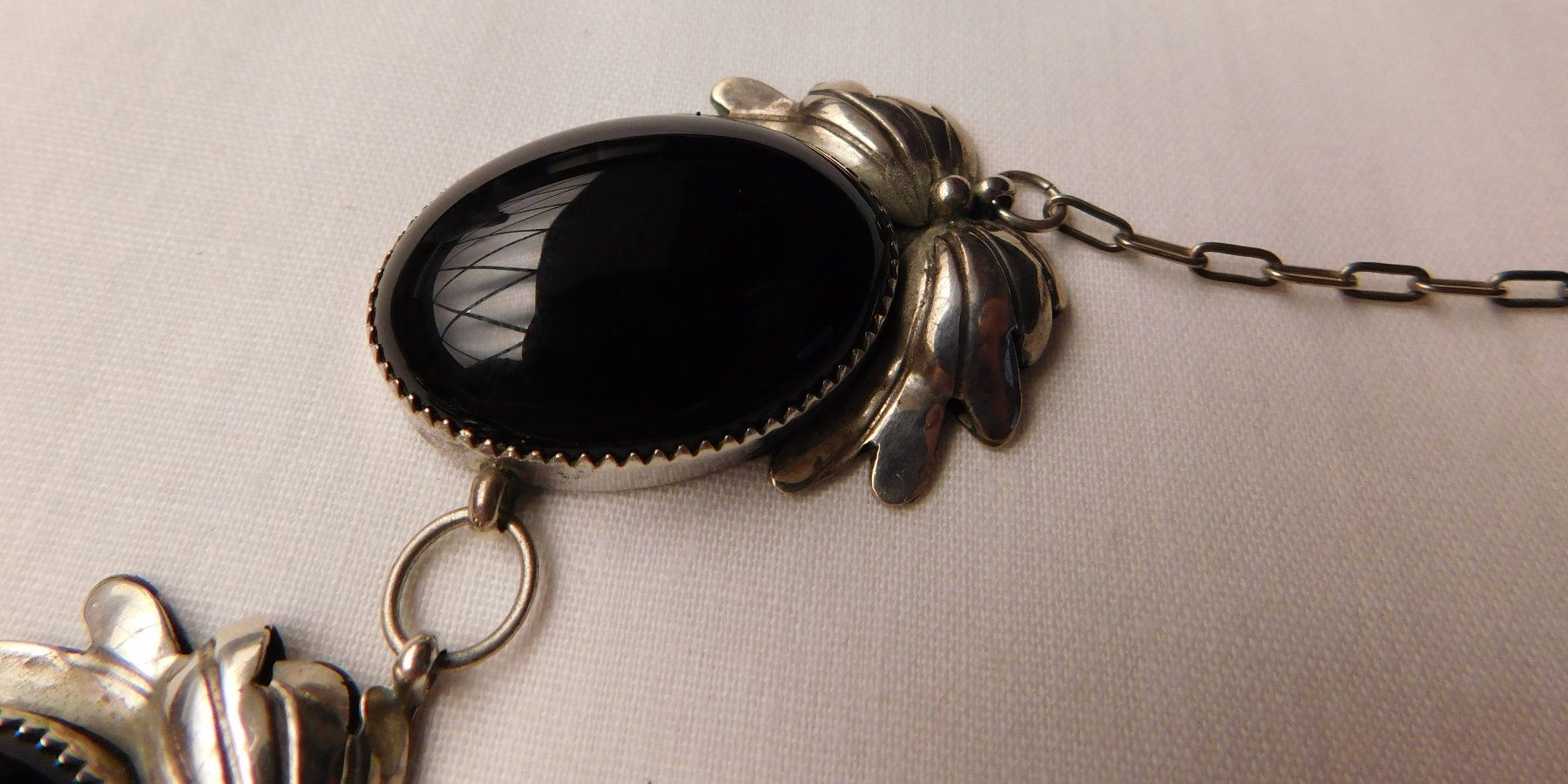 Signed Sterling Silver & Jet Necklace, c. 1950s. Made of sterling silver and jet, the item hangs 11 3/4" as worn, and weighs 53.4 grams. Condition: Good, pre-owned, see images. Shipping: $12.50 w/insurance and signature.