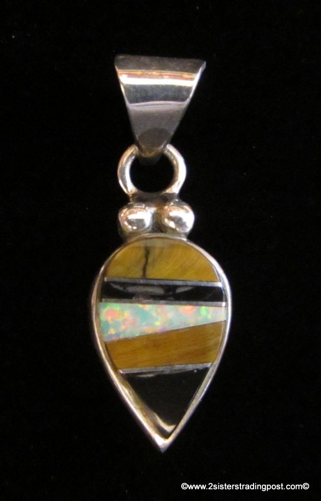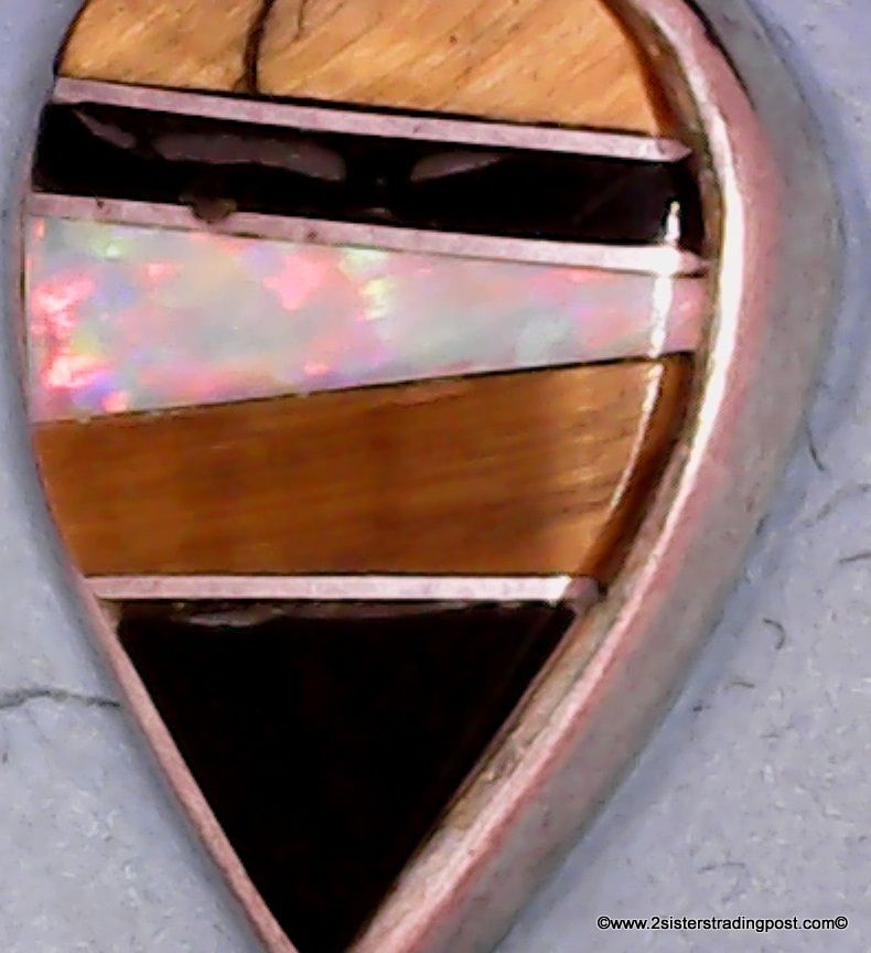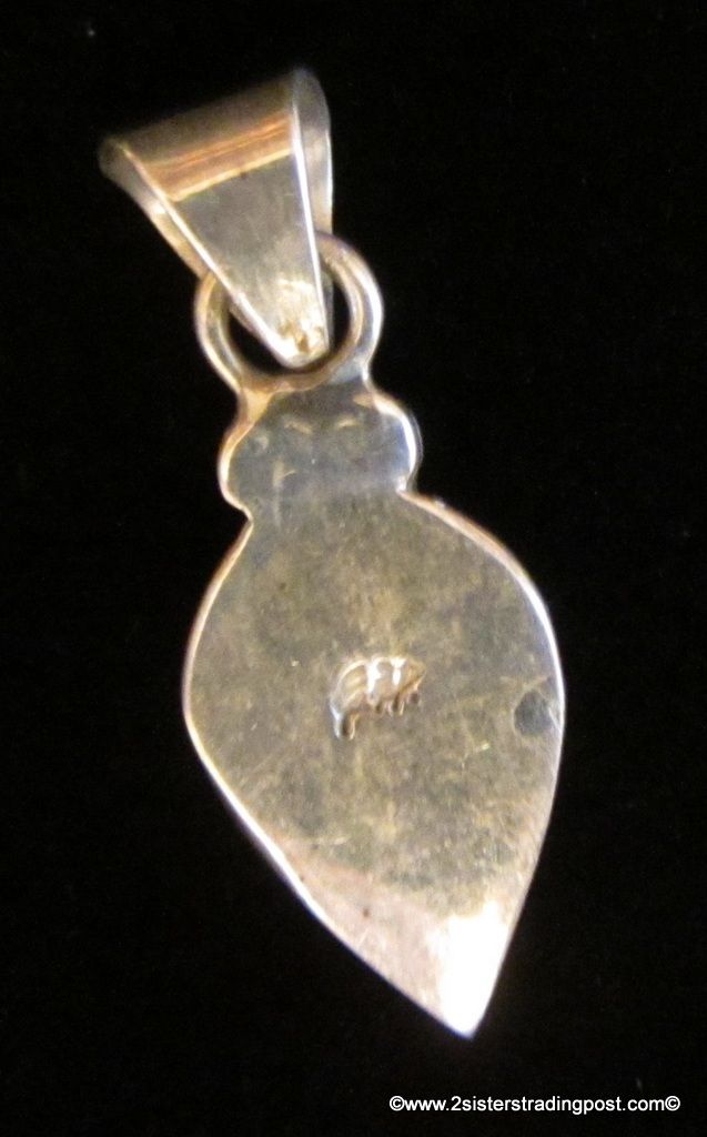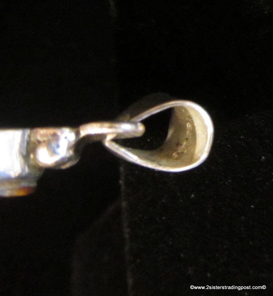 Sterling teardrop pendant has an inly pattern of five slices of three different types of stone each separated with a strip of sterling. Teardrop measures without bail and top design 15 mm long by 10.5 mm wide overall measurement with a bail 30 mm, pendent weighs 3 g. Piece is not stamped sterling, (has been tested is silver) it is stamped with Hallmark (Hallmark is unidentifiable)