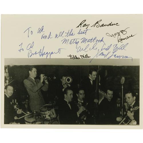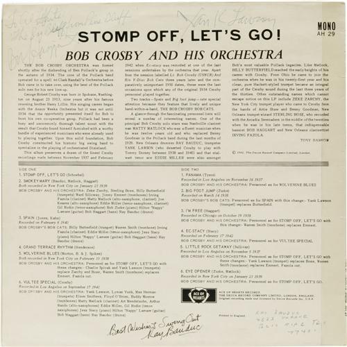 <B>Signed "Stomp Off Let's Go - Bob Crosby and His Orchestra" Ace of Hearts (UK issue) AH 29 Mono LP, with Autographed Photograph (1962).</B></I> Bob Crosby cooks with Orchestra members Ray Baudic (drums), Bob Haggart (bass), Eddie Miller (sax), and Yank Lawson (trumpet). The album cover was autographed by Baudic, Haggart, and Lawson. Also included in this lot is a photograph, autographed by Baudic, Haggart, Lawson, Miller, and Nappy Lamare (guitar). Condition: VG++/VG++. <I>From the Al White Jazz autograph archive.</B></I>