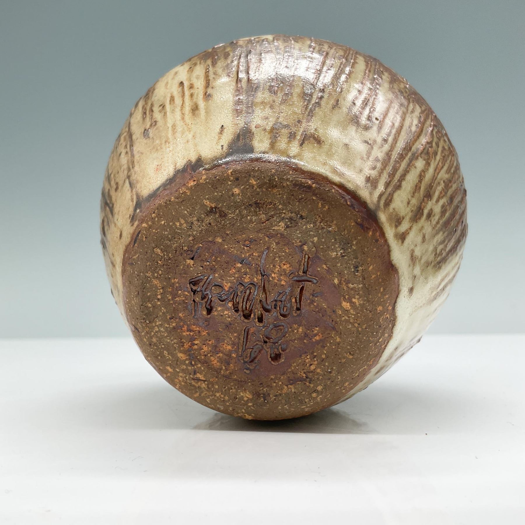 Handcrafted studio pottery vase featuring a textured abstract glaze with earth-toned hues. Measures 4.75"H and is signed on the base. The artist's signature adds a unique collectible appeal. A fine example of mid-century studio pottery, perfect for collectors or decor enthusiasts.