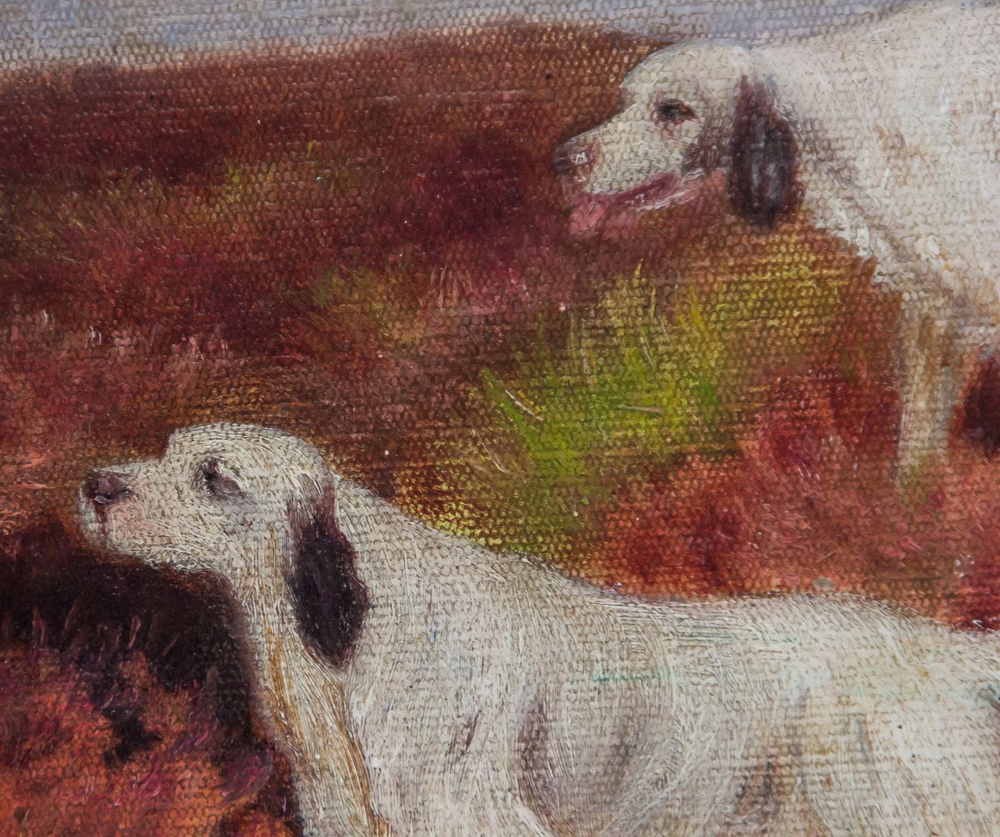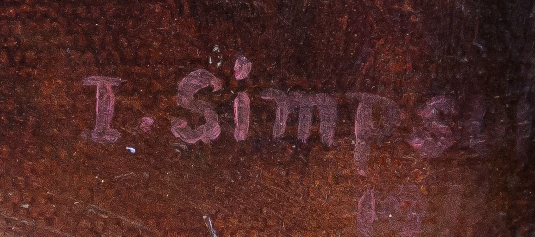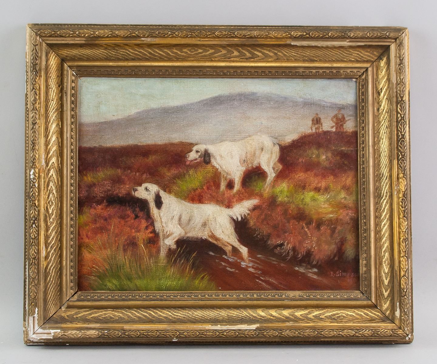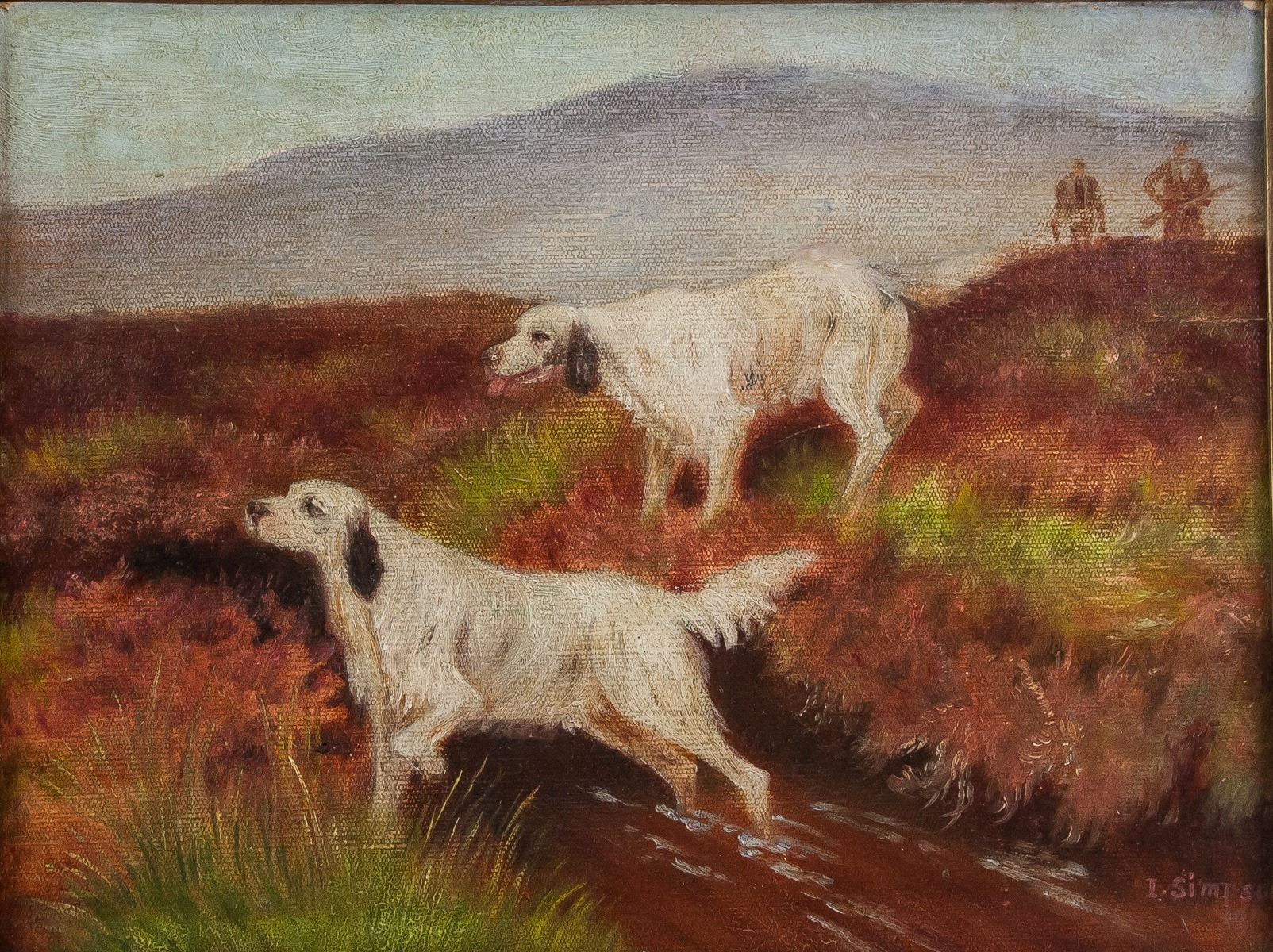 Oil on canvas, framed. Featurng pair of hunting dogs. Signed T. Simpson on the lower right corner. British school. 29 x 37 cm (11.4 x 14.6 inches). Framed size: 40.5 x 49 cm (15.9 x 19.3 inches). PROVENANCE: Private European collection (Bayern, Germany).