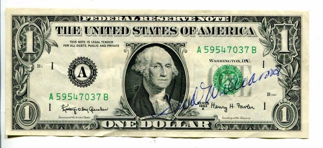 Ted Williams signed US currency.  This item is sold as is and has third party authentication .This item comes with a Certificate of Authenticity from a third party authenticator. This Certification of Authenticity does not imply that the item will be certified by any other rival authentication companies. The accompanied certification is the only certification the auction company can confirm. These items are being sold as collectable pieces and there is no guarantee that this item can be resold on any online marketplace. Each of these companies has their own policies and politics.