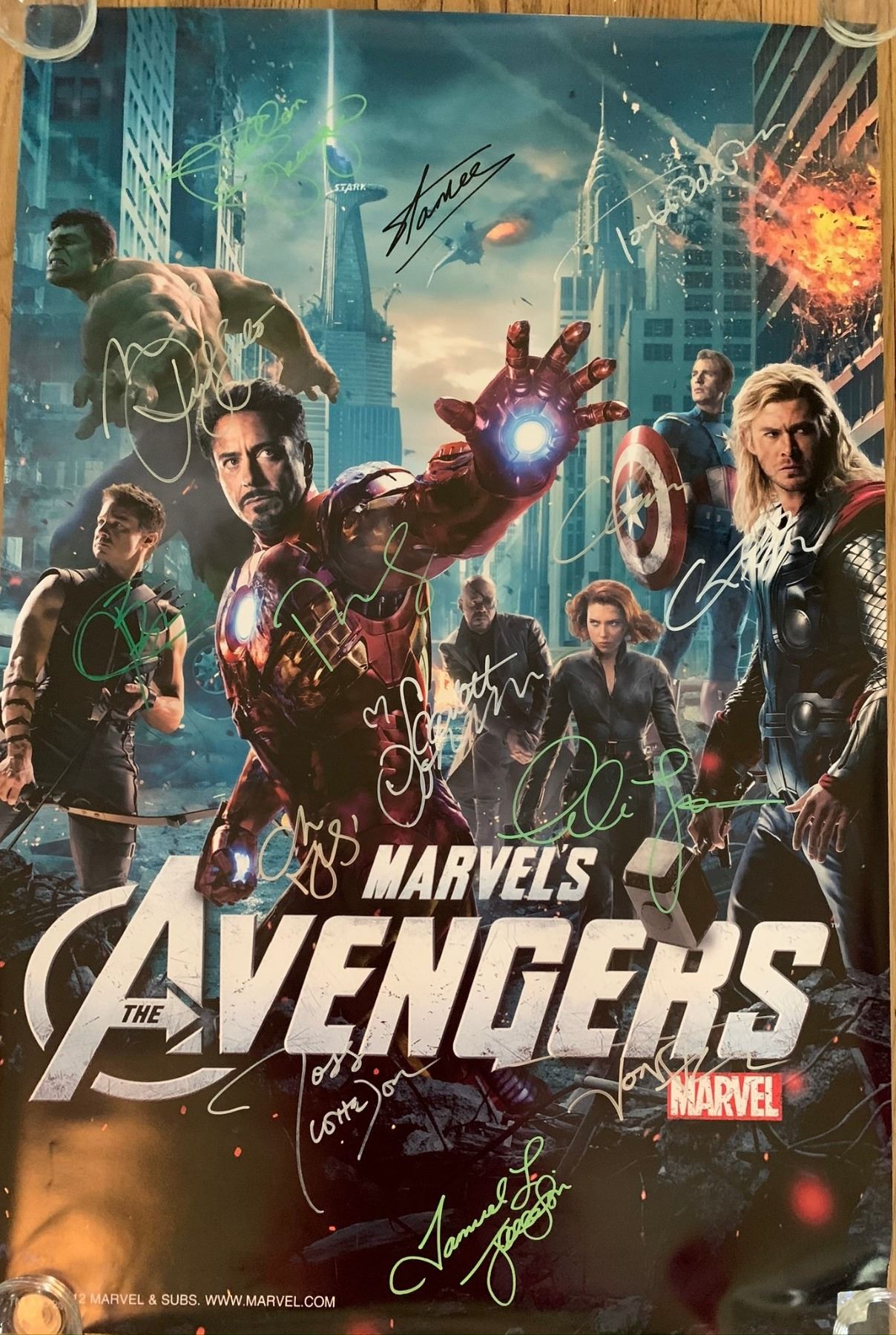 Signed by Robert Downey Jr., Chris Hemsworth, Chris Evans, Mark Ruffalo, Jeremy Renner, Samuel L. Jackson, Scarlett Johansson, Tom Hiddleston, Clark Gregg, Stellan Skarsgard, Cobie Smulders, Jon Favreau, creator Stan Lee and Joss Whedon