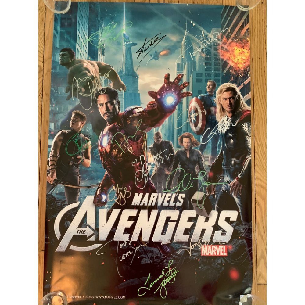 Signed by Robert Downey Jr., Chris Hemsworth, Chris Evans, Mark Ruffalo, Jeremy Renner, Samuel L. Jackson, Scarlett Johansson, Tom Hiddleston, Clark Gregg, Stellan Skarsgard, Cobie Smulders, Jon Favreau, creator Stan Lee and Joss Whedon