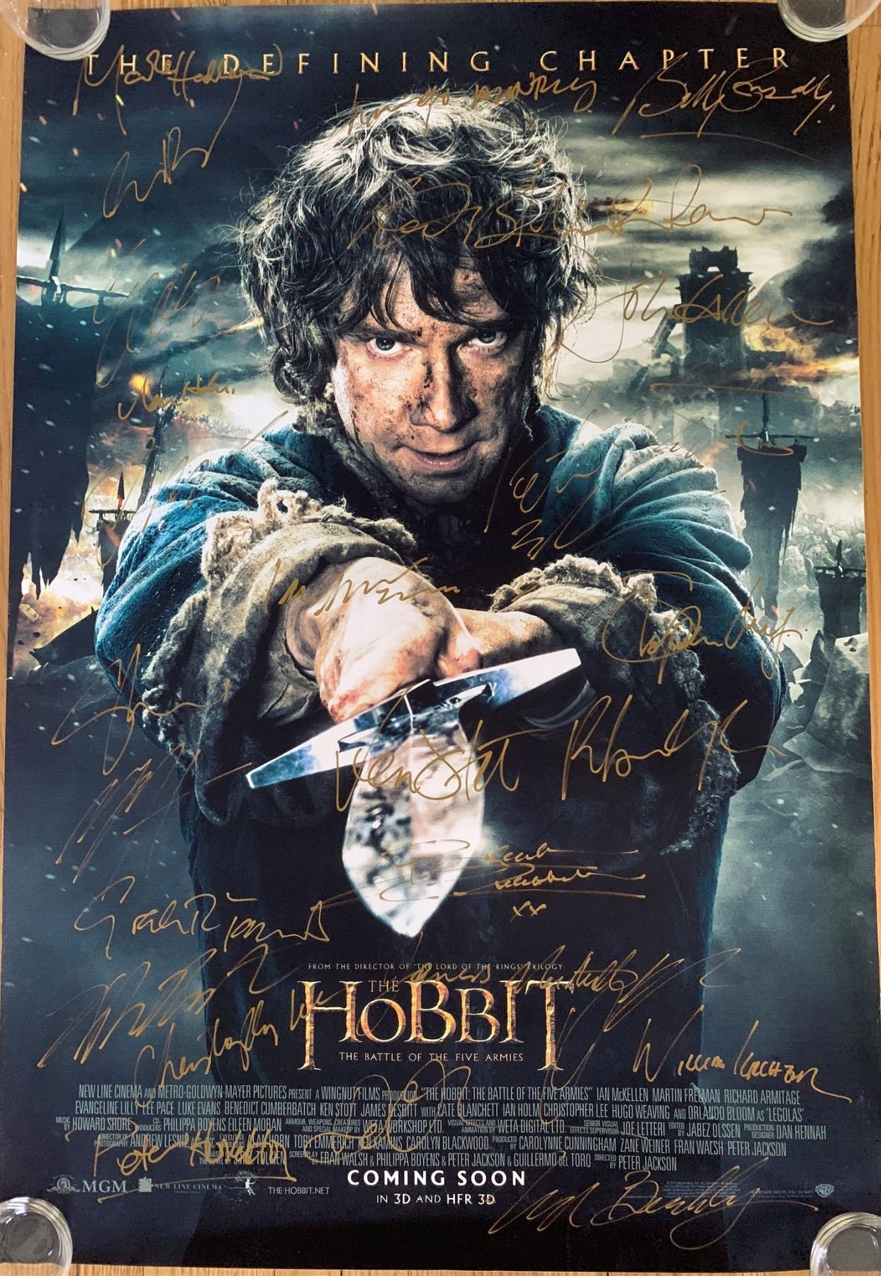 Signed by: Luke Evans, Benedict Cumberbatch, Lee Pace, Evangeline Lilly, Richard Armitage, Graham McTavish, Cate Blanchett, Orlando Bloom, Manu Bennett, Martin Freeman, Ian McKellan, Hugo Weaving, Aidan Turner, Christopher Lee, Billy Connolly, Stephen Fry, Ian Holm, Dean O'Gorman, James Nesbitt, Ken Stott, Adam Brown, Peter Hambleton, Will Kircher, Jed Brophy, Stephen Hunter, Mark Hadlow, John Callen and director Peter Jackson.