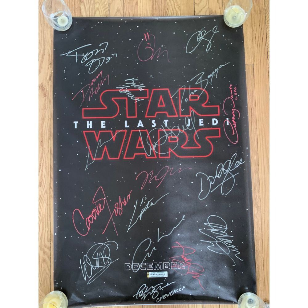 Signed by Carrie Fisher, Rian Johnson, Daisy Ridley, John Boyega, Mark Hamill, Tom Hardy, Oscar Isaac, Adam Driver, Domhnall Gleeson, Gwendoline Christie, Benicio del Toro, Billie Lourde, Andy Serkis, Lupita Nyongo, Peter Mayhew, and Anthony Daniels