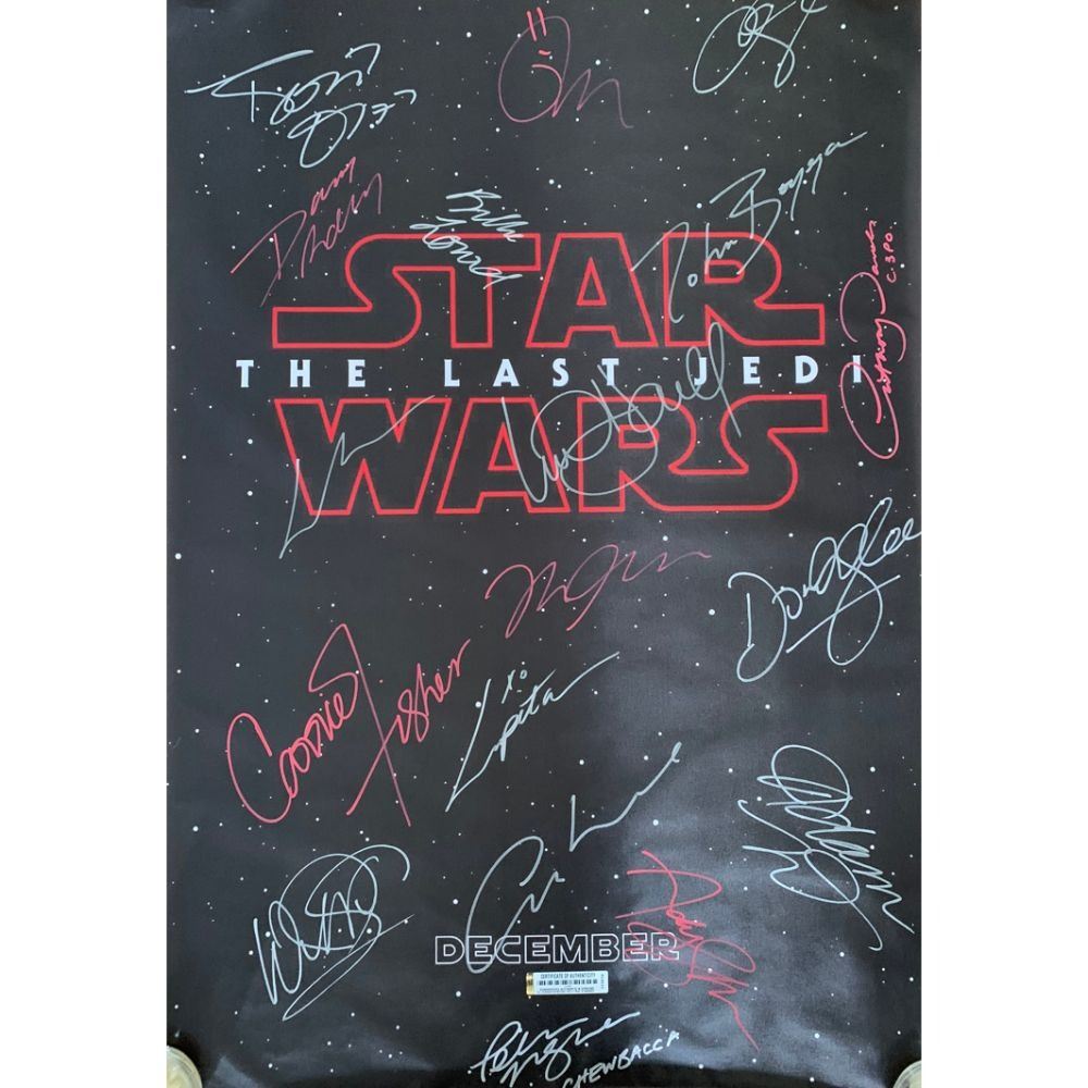 Signed by Carrie Fisher, Rian Johnson, Daisy Ridley, John Boyega, Mark Hamill, Tom Hardy, Oscar Isaac, Adam Driver, Domhnall Gleeson, Gwendoline Christie, Benicio del Toro, Billie Lourde, Andy Serkis, Lupita Nyongo, Peter Mayhew, and Anthony Daniels