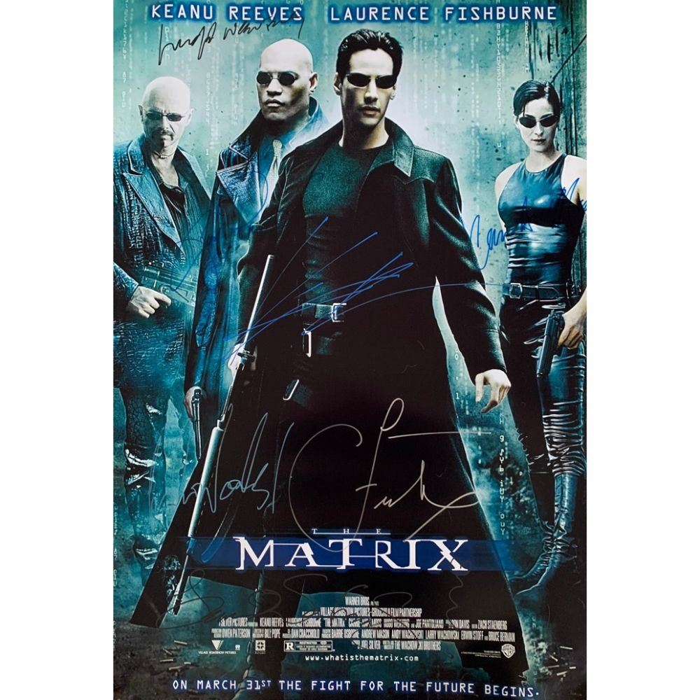 Signed by Keanu Reeves, Laurence Fishburne, Carrie Anne Moss, Joe Pantoliano, and Hugo Weaving.