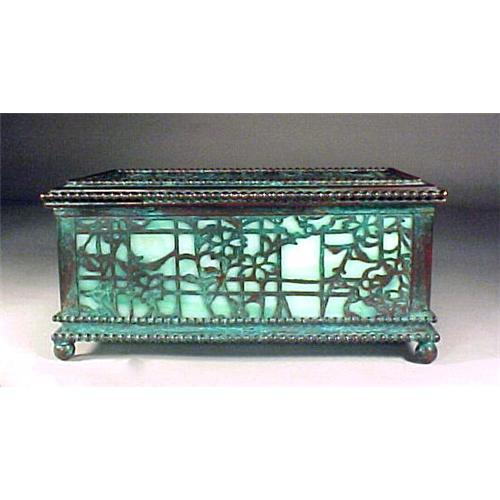 <tr><td>Title: Signed Tiffany Box Bronze Glass Trellis Patern</td></tr>