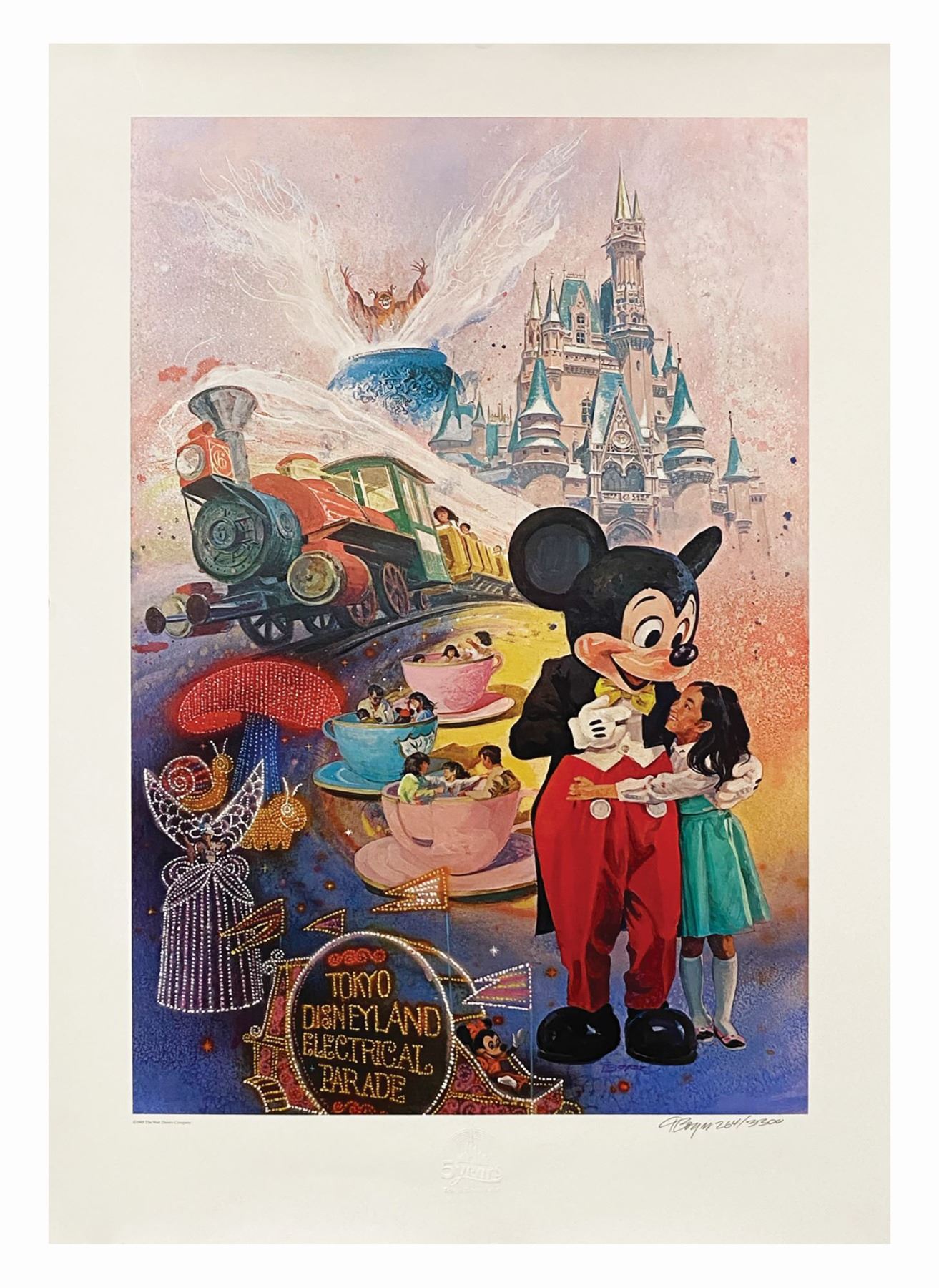 (Tokyo Disneyland, 1988) A beautiful lithograph by Charles Boyer, created to commemorate the 5th anniversary of Disneyland. The 30"x20" lithograph is signed by Boyer in the bottom-right corner. The lithograph is numbered 264/3300 and is in very good condition with some minor edge-wear.