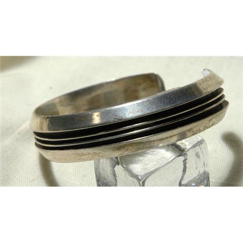Modern hand crafted sterling overlay bracelet my talented silversmith artisan Tom Hawks. The bracel measure 2 1/2 across and the opening is 1 1/8" Although the fit it adjustable by gentle pressure on the bracelet and since it is pure sterling silver it will flex some. However you must be very careful and not over do it. The bracelet weighs 42 grams. The condition is very good. <P>