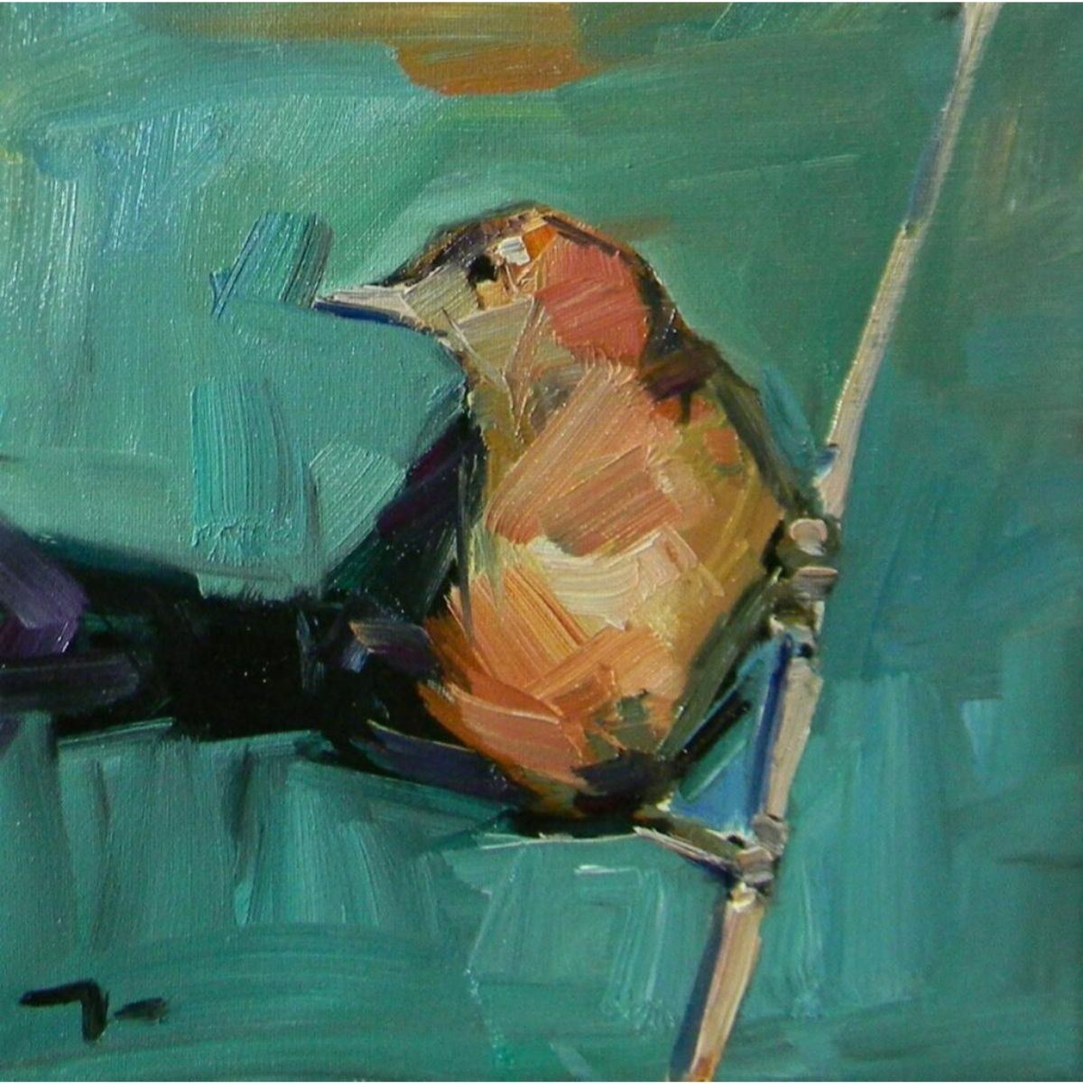 Jose Trujillo ( Mexico 1982 - ) 21st Century impressionist scene, little finch bird on branch. "Bird's Song"" 10" X 10" on stretched canvas. Signed by the artist in 2019 on the reverse, with certificate of authenticity.