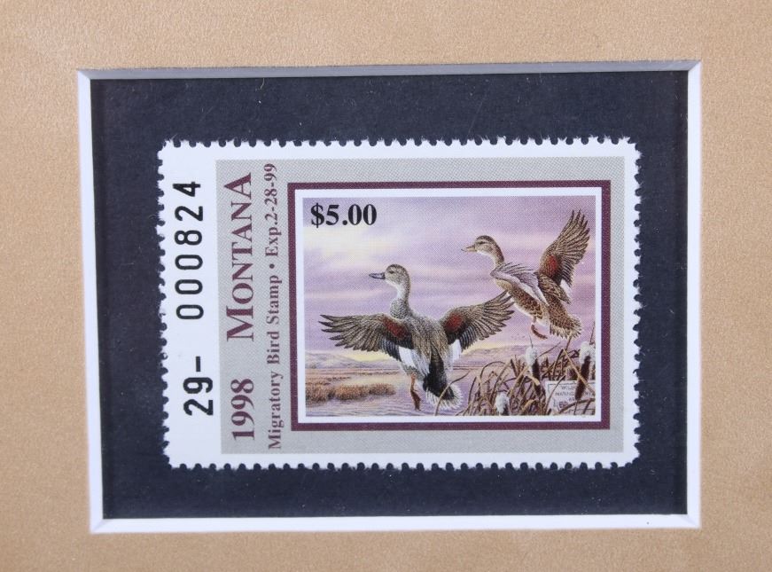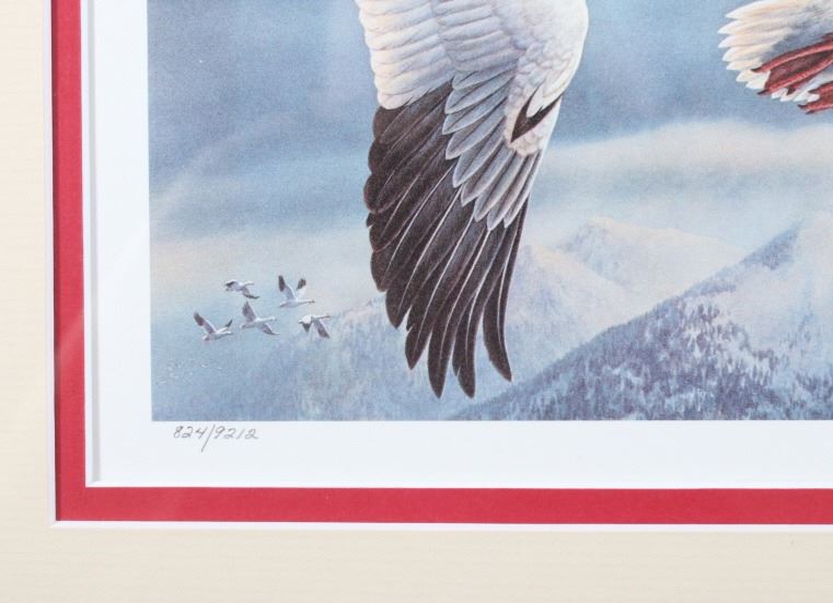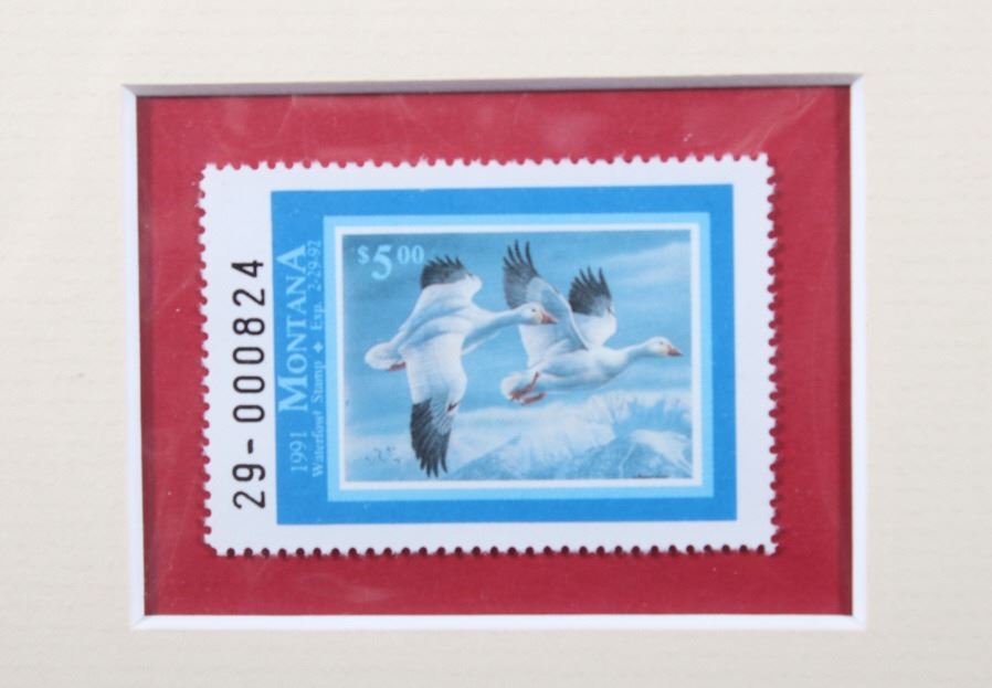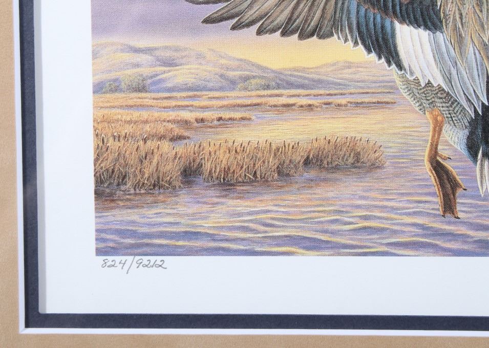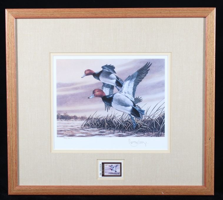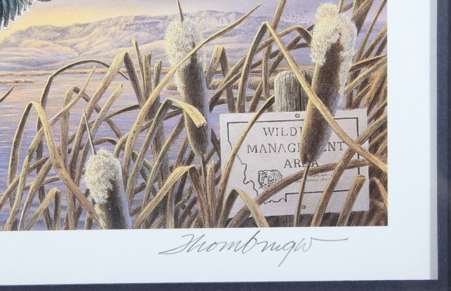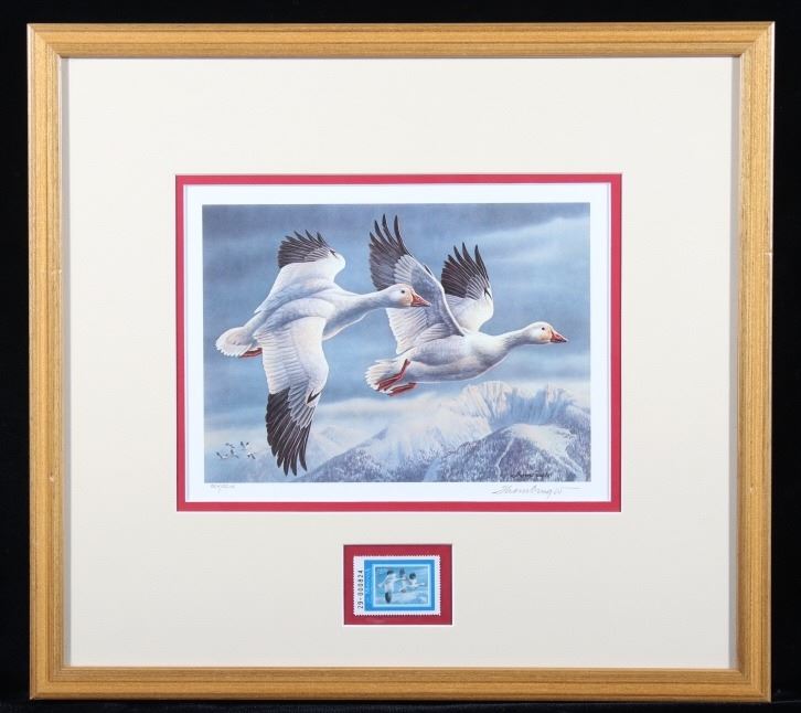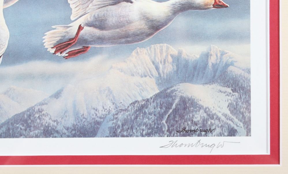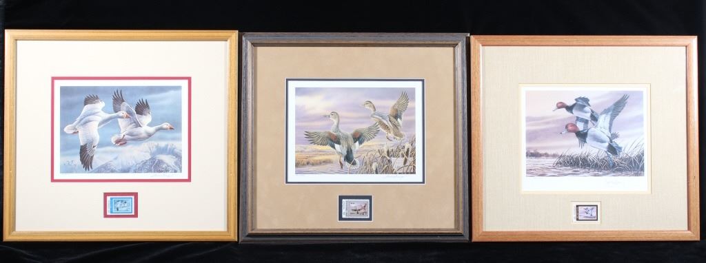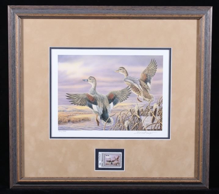 Included in this lot we have a set of three framed paintings of water fowl with their corresponding stamp originating from the 1980' to 1990's. Each framed piece shows a U.S. stamp that is part of one of the game bird collections along with a signed print of the original artwork on the stamp. The first of the pieces shows a pair of snow geese flying over a snow covered mountain range. The second print and stamp shows a drake and hen Gadwall duck as they take off out of some reeds over a lake with rolling hills in the background. The third and final print shows a drake and hen Redhead ducks as they fly just above the water of a lake and reeds. The prints are all hand signed by the artist Joe Thornbrugh and Cruays, They are marked "824/9212" with the stamps all numbered "29-000824". The pieces are set into nice wooden frames with brown of tan borders around the art and stamps. The collection shows good condition overall with some light wear on the frames. The frames measure between 17 1/4" wide by 15 3/4" tall.