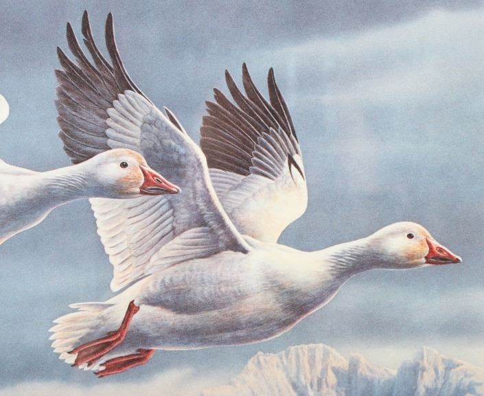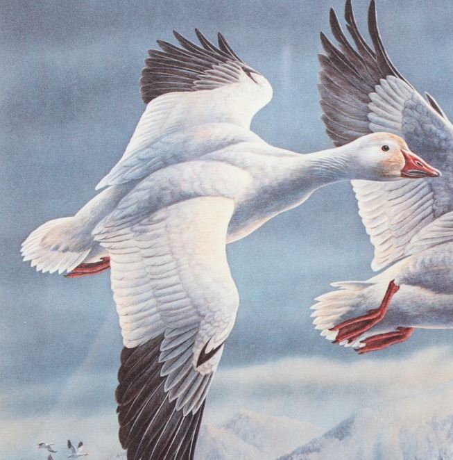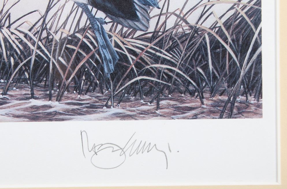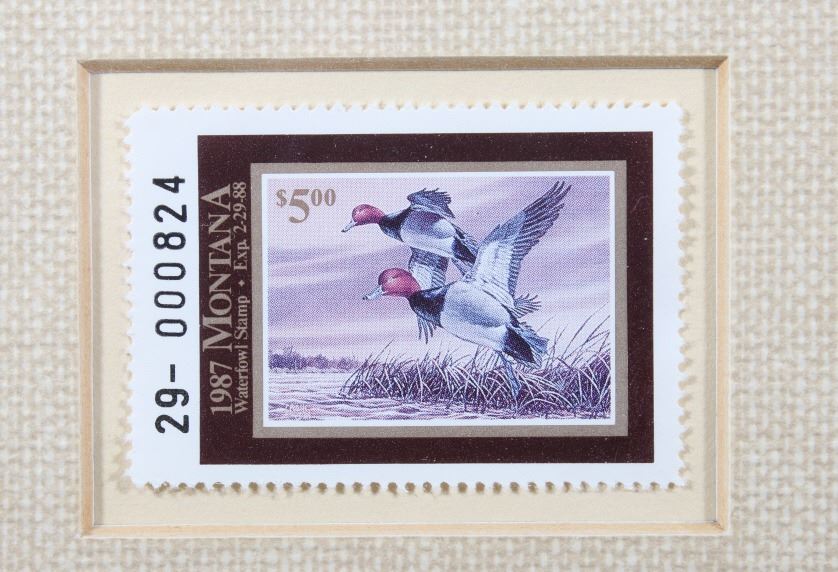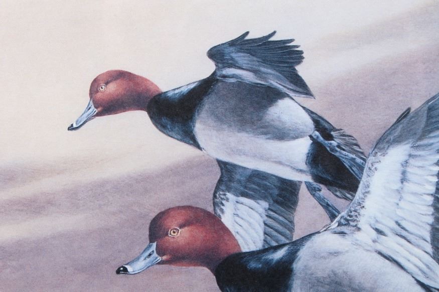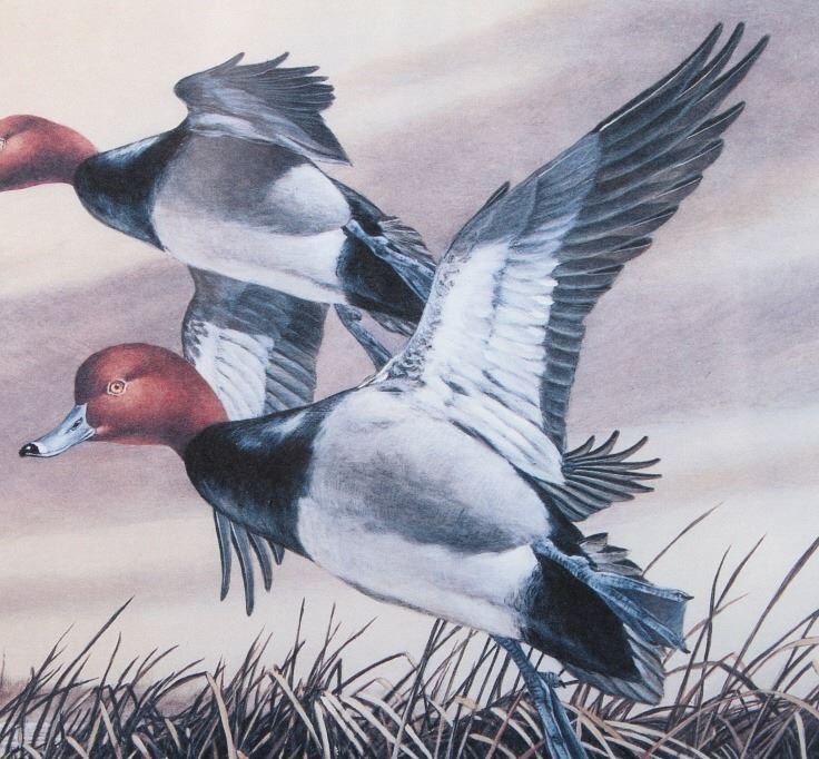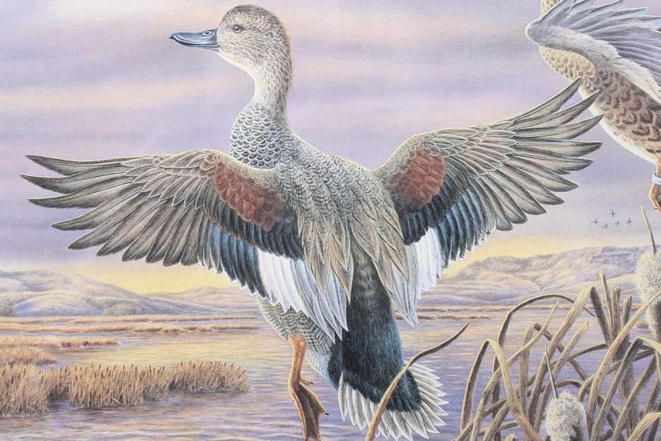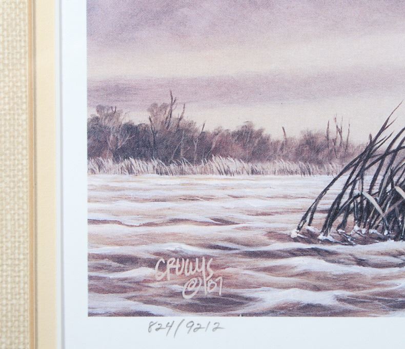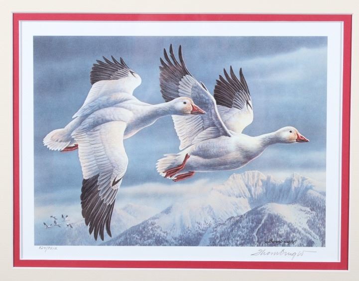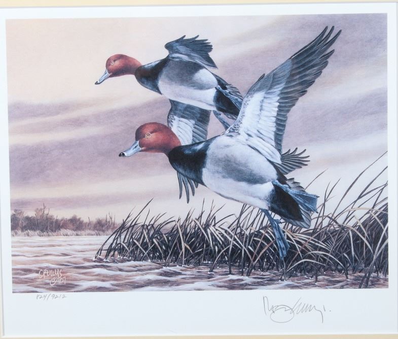Included in this lot we have a set of three framed paintings of water fowl with their corresponding stamp originating from the 1980' to 1990's. Each framed piece shows a U.S. stamp that is part of one of the game bird collections along with a signed print of the original artwork on the stamp. The first of the pieces shows a pair of snow geese flying over a snow covered mountain range. The second print and stamp shows a drake and hen Gadwall duck as they take off out of some reeds over a lake with rolling hills in the background. The third and final print shows a drake and hen Redhead ducks as they fly just above the water of a lake and reeds. The prints are all hand signed by the artist Joe Thornbrugh and Cruays, They are marked "824/9212" with the stamps all numbered "29-000824". The pieces are set into nice wooden frames with brown of tan borders around the art and stamps. The collection shows good condition overall with some light wear on the frames. The frames measure between 17 1/4" wide by 15 3/4" tall.