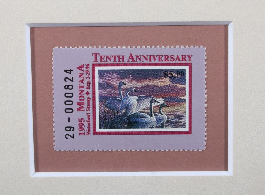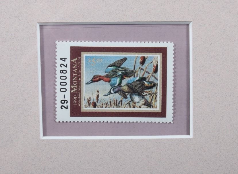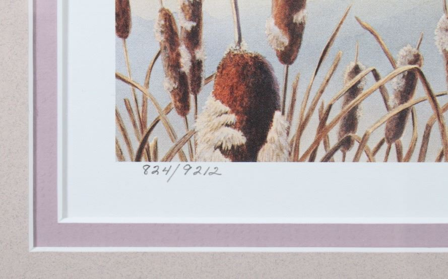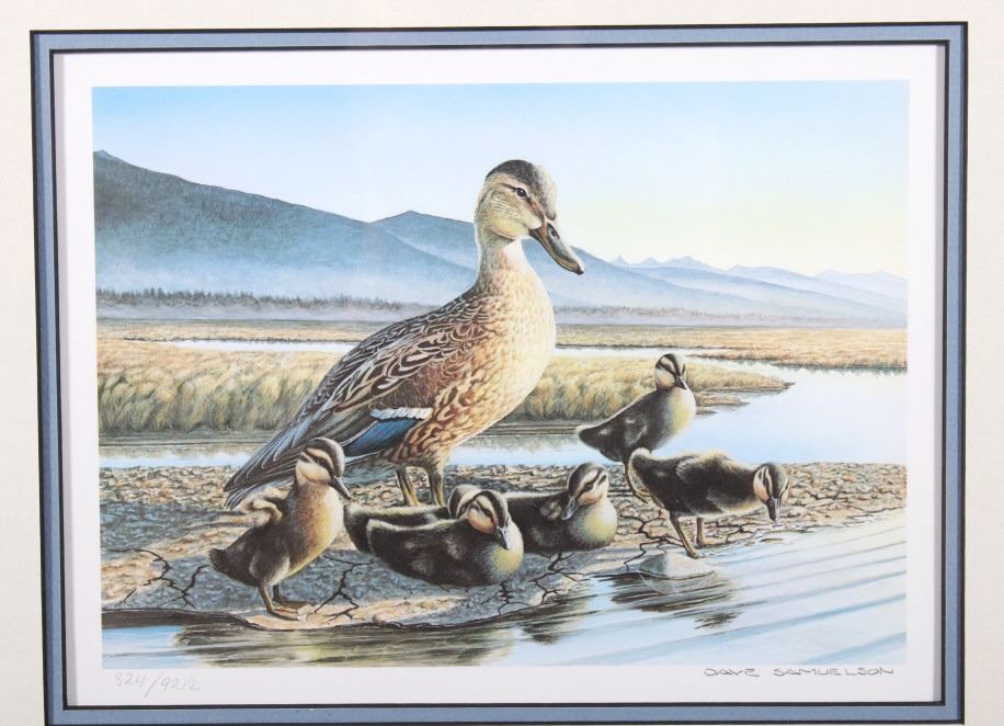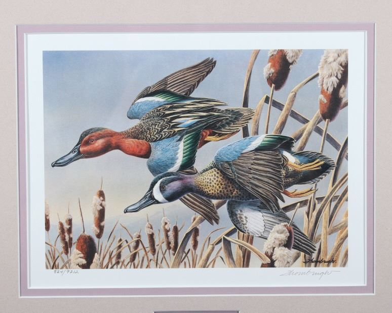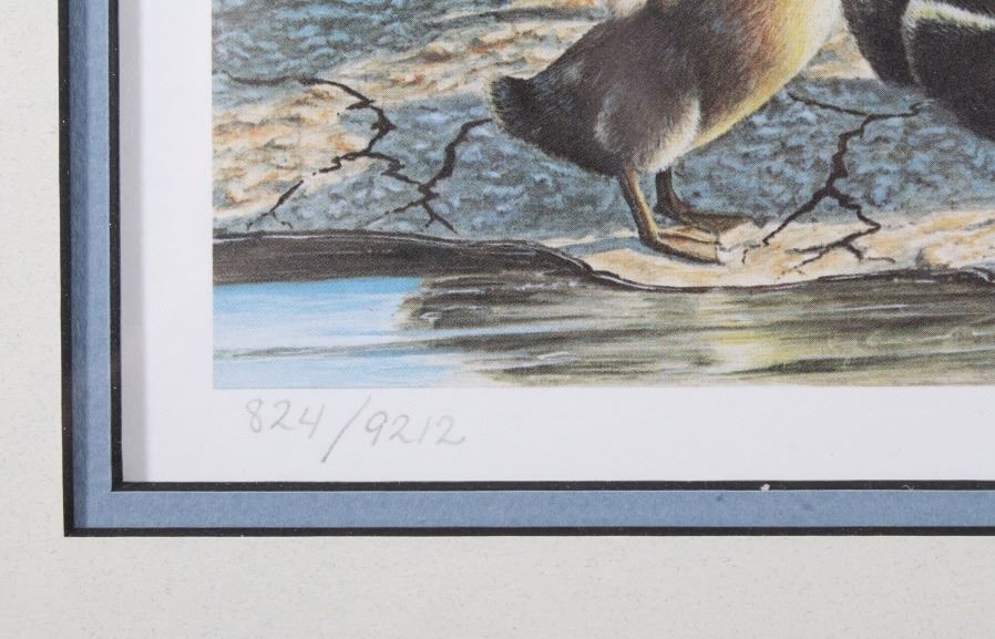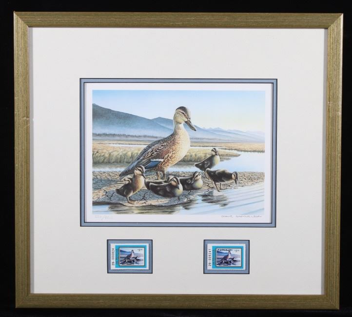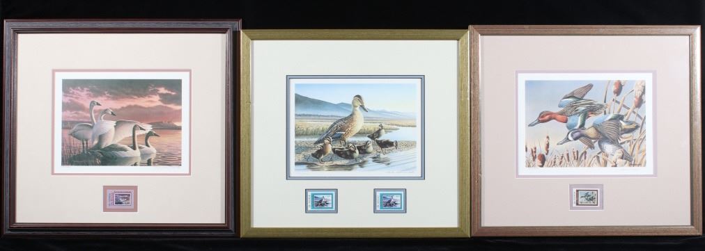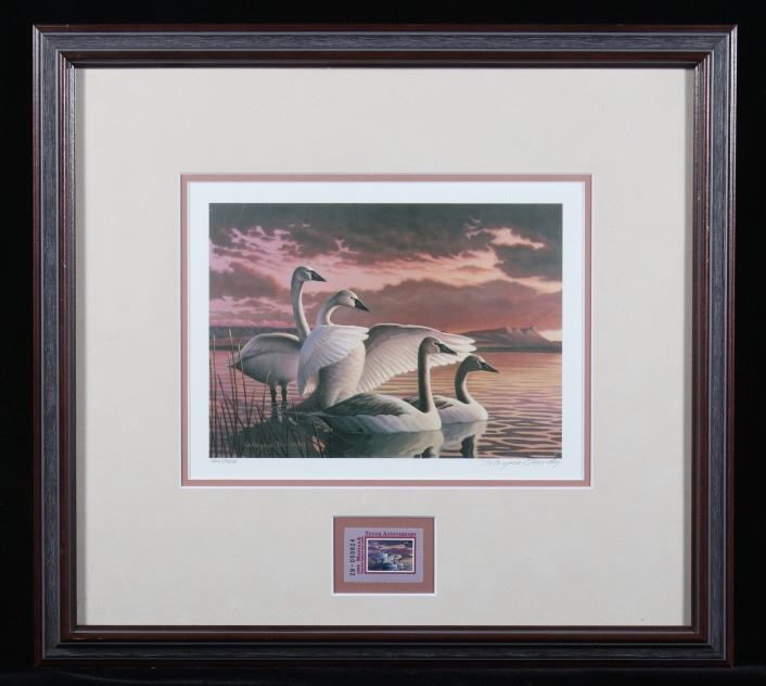Included in this lot we have a set of three framed paintings of water birds with their corresponding stamp originating from the 1980' to 1990's. Each framed piece shows a U.S. stamp that is part of one of the water or game bird collections along with a signed print of the original artwork on the stamp. The first of the pieces shows a group of four Tundra swans on a lake as the sun sets. The piece was painted by Wayne Dowdy for the 10th Anniversary of the waterfowl stamp collection. The second piece shows a Mallard duck hen with six ducklings around her feat as they stand at the edge of a river. The piece shows two stamps along the bottom and has been hand signed by Dave Samuelson and is marked "824/9212". The third and final piece shows a cinnamon teal drake and a blue-winged teal drake flying through cattails. The print is hand numbered and signed by Joe Thronbrugh. All the stamps aside from the second mallard stamp are numbered "29-000824". The prints are set into wooden frames with tan borders around the art. The pieces show good condition overall with some minor wear across the frames. The first frame measures 18" wide by 16 1/2" tall with the art measuring 10 1/4" wide by 7 1/2" tall, the second measures 17" wide by 15 1/2" tall with the art measuring 9 3/4" wide b 7 1/4" tall, and the third measures 17 1/4" wide by 15 3/4" tall with the print measuring 10" wide by 7 1/2" tall.