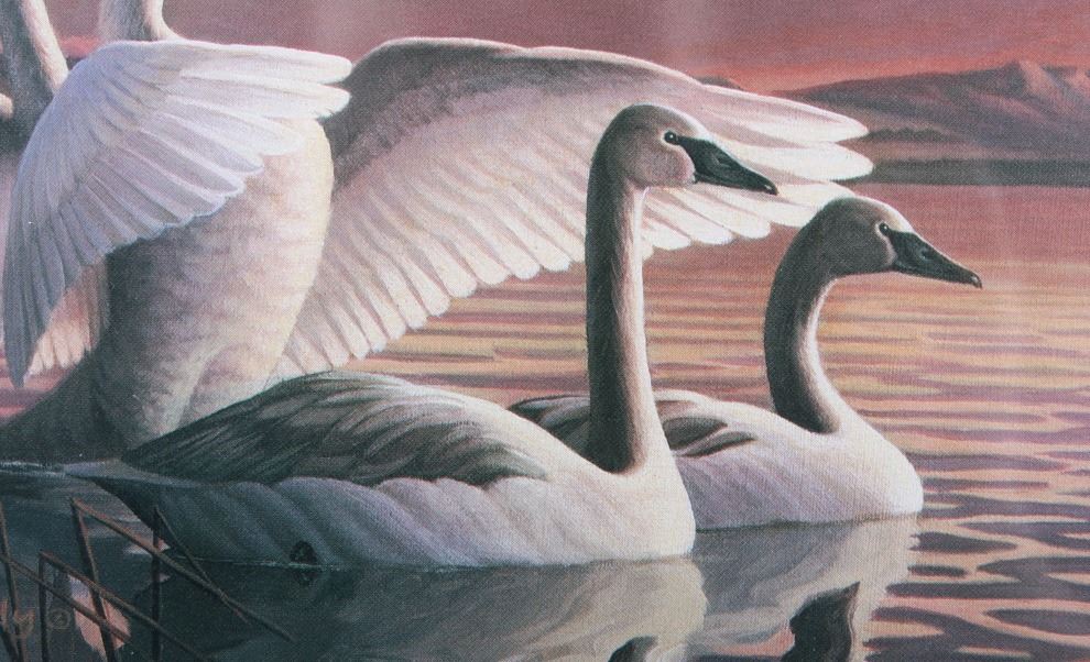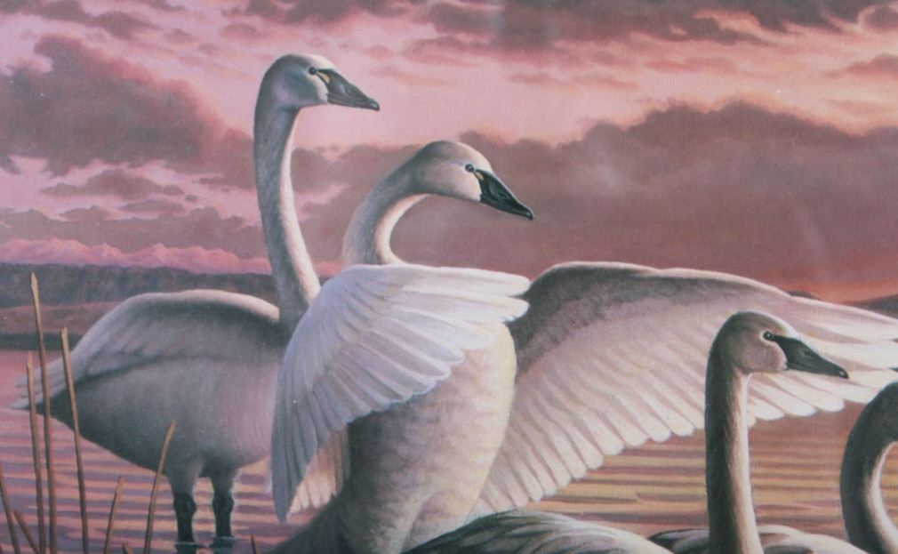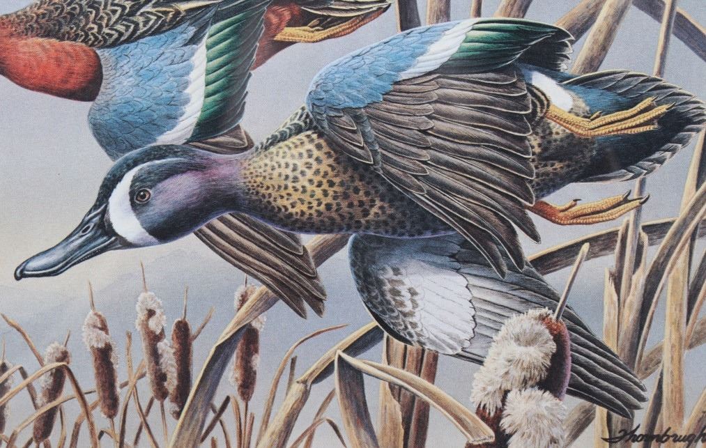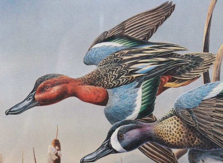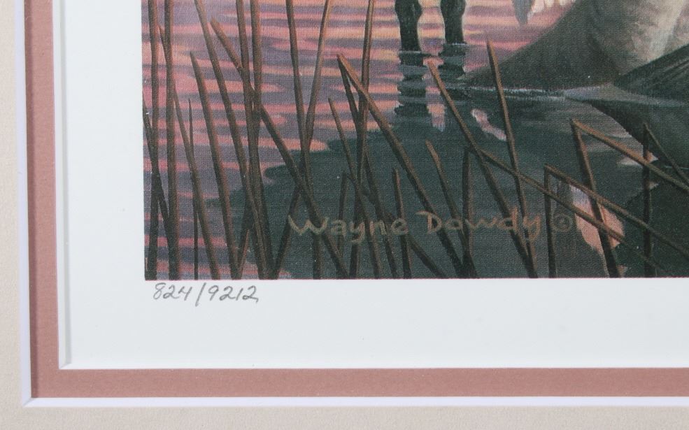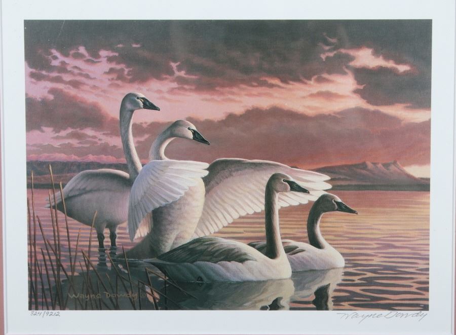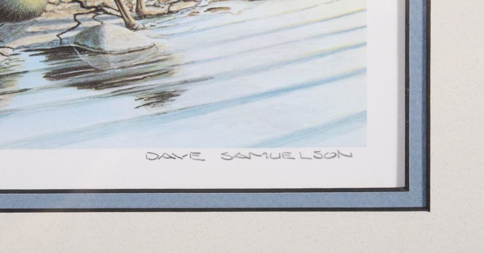 Included in this lot we have a set of three framed paintings of water birds with their corresponding stamp originating from the 1980' to 1990's. Each framed piece shows a U.S. stamp that is part of one of the water or game bird collections along with a signed print of the original artwork on the stamp. The first of the pieces shows a group of four Tundra swans on a lake as the sun sets. The piece was painted by Wayne Dowdy for the 10th Anniversary of the waterfowl stamp collection. The second piece shows a Mallard duck hen with six ducklings around her feat as they stand at the edge of a river. The piece shows two stamps along the bottom and has been hand signed by Dave Samuelson and is marked "824/9212". The third and final piece shows a cinnamon teal drake and a blue-winged teal drake flying through cattails. The print is hand numbered and signed by Joe Thronbrugh. All the stamps aside from the second mallard stamp are numbered "29-000824". The prints are set into wooden frames with tan borders around the art. The pieces show good condition overall with some minor wear across the frames. The first frame measures 18" wide by 16 1/2" tall with the art measuring 10 1/4" wide by 7 1/2" tall, the second measures 17" wide by 15 1/2" tall with the art measuring 9 3/4" wide b 7 1/4" tall, and the third measures 17 1/4" wide by 15 3/4" tall with the print measuring 10" wide by 7 1/2" tall.