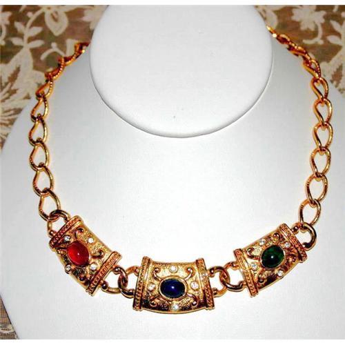 This signed Necklace was produced by Avon in the 1950s-60s with gold tone metal links and 3 large plates in the center. Each plate has a red, blue or green oval Glass Cabochon, bezel set and surrounded by small, brilliant white, bezel set Rhinestones. The center plate is marked Avon. Measuring 17 1/2 inches long and closing with a C hook.