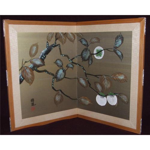 Signed vintage two-panel Japanese wall or table screen, handpainted on silk, framed in natural wood with ornate metal trim. This elegant painting features Japanese pears, leaves, and branches on gold silk. It is "matted" in a light gold brocade fabric; the panel backs are covered in a cream and green patterned fabric. Each panel measures approximately 16.5 inches high and 12 inches wide. This piece is in very good to excellent condition, clean, with no damage. It was purchased from an antique-filled estate which had been stored for over 25 years. Please refer to the 4 photographs for appearance and condition. Shipping, packaging, handling will be $13.50.