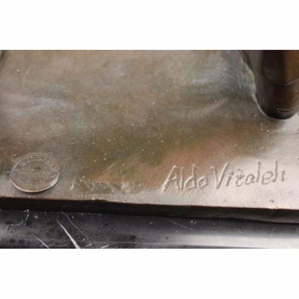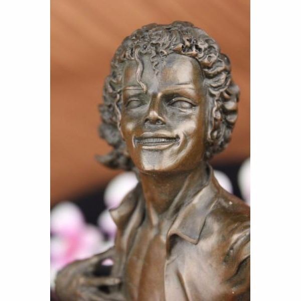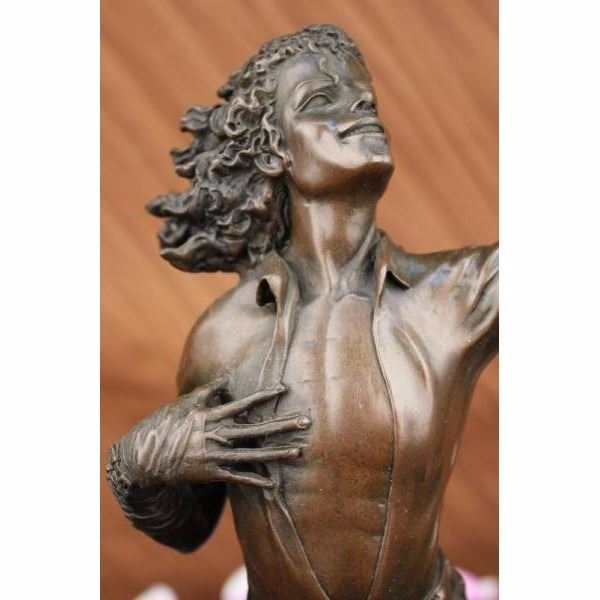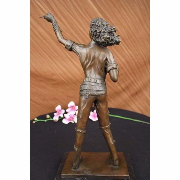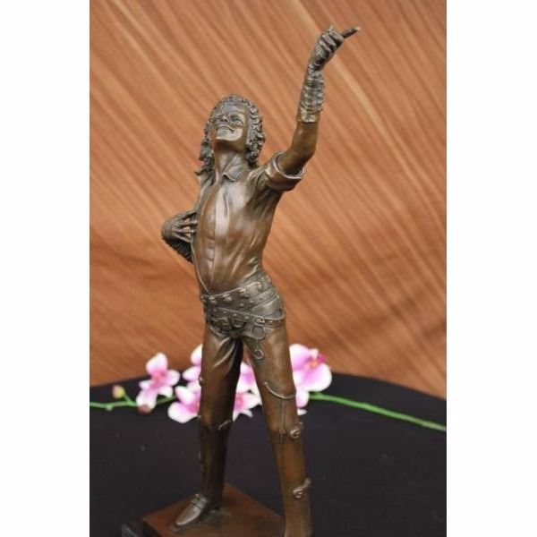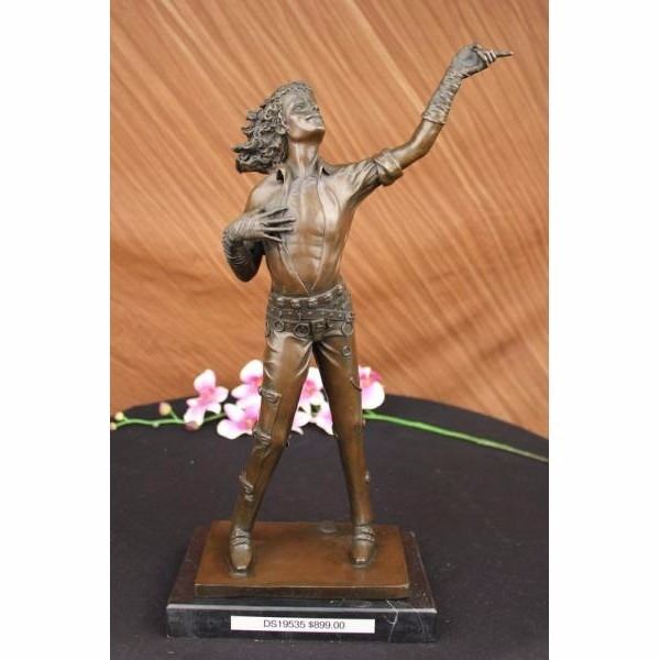 Billy Jean. Bad. Or just a Smooth Criminal. No matter what you called him, he was still the greatest. Michael Jackson's legacy spanned decades and generations. His contributions to music, dance and fashion made him the most recognized icon of all time. From the first time he took the stage as just a child in the sixties, he had transformed the music scene forever. Michael's extreme fashion choices have been mimicked for years. From his single glittered glove to his moon-walking black shoes. His music videos are timeless and the costumes he wore in them are easily identifiable. This sculpture depicts Michael in his Black and White video. In true Jackson dramatics, he ripped his white shirt open and thrust a fingerless-gloved hand to the sky. His curly hair blew back in the raging wind and he smiled triumphantly.His pants were covered with chains and belts. His body felt the beat he created and never stopped moving. 100% bronze and handmade, this brown patina sculpture was cast using the "Lost Wax Method" and mounted on a marble base. He may have been lost but you can still take greatness home with you and is signed by artist Aldo Vitaleh. Condition: This sculpture is in perfect condition. Bronze Dimensions with Marble Base:Height 18" x Width 8 1/2" Marble Dimensions: 8 1/2" x 5" Height without base: 17" Weight : 15 LBS Inventory : 45DS1955354