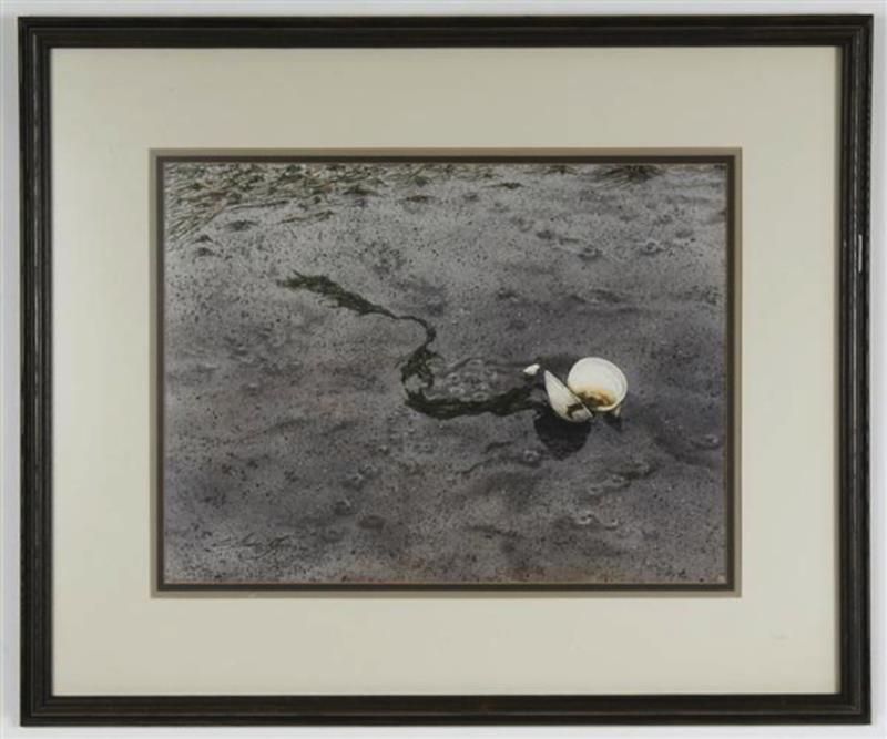CAROL STECHER-JONES (Washington) listed artist. Rare WATERCOLOR ON PAPER - Signed beach scene with shell and seaweed titled "Low Tide" - Condition good - Dated 1982 - 24" x 28.5" framed