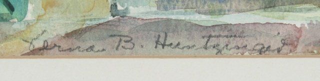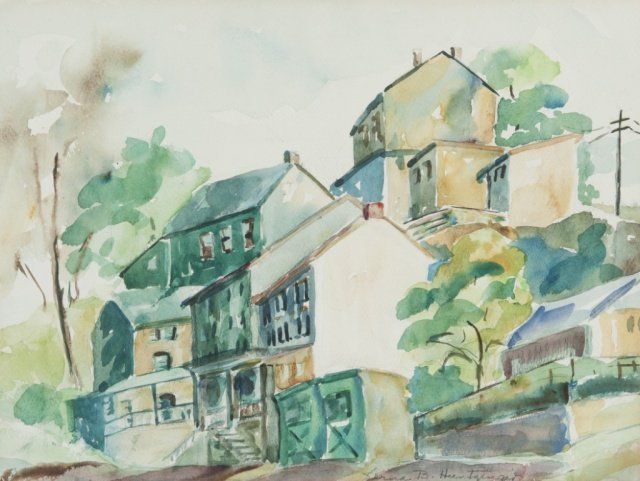 WPA style composition of houses on a hill. Watercolor on paper. 1st half 20th century. Signed at l.r. illegibly, possibly, "Verna B. Huntg..." Matted and framed under glass. Sight: 11 1/4" x 15". Frame: 19 3/4" x 23".