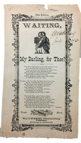 Single page containing the poem: "Waiting, My Darling, for Thee!", published by William J. Schmidt, Illustrated song publisher, Baltimore, MD. Page is very elaborately decorated with its printed border surrounding the poem.