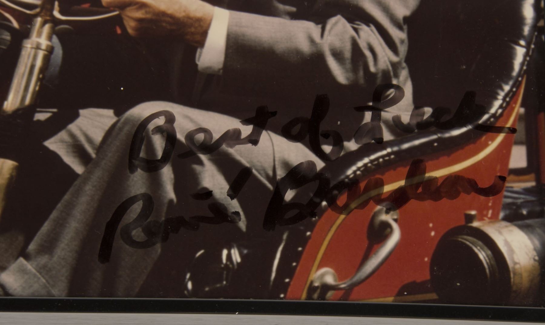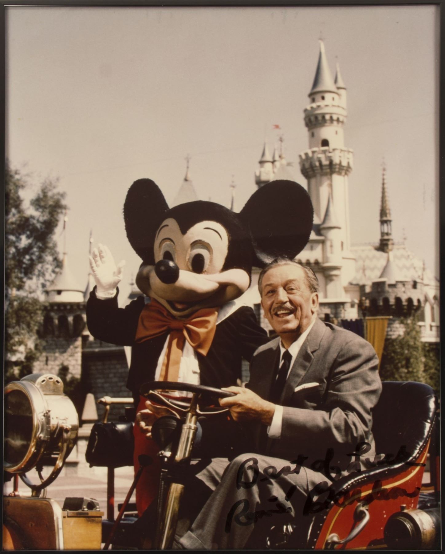 (Disneyland, c.1964) An original photo signed by renowned Disney photographer Renie Bardeau. This photo is credited as the last photo that Bardeau took of Walt in Disneyland, and features Walt and Mickey sitting behind the wheel of a firetruck and Sleeping Beauty Castle highlighted in the distance. Bardeau is well known for capturing the iconic photo, "Footsteps." This photo measures 14.5"x11" and is in very good condition with minor wear.