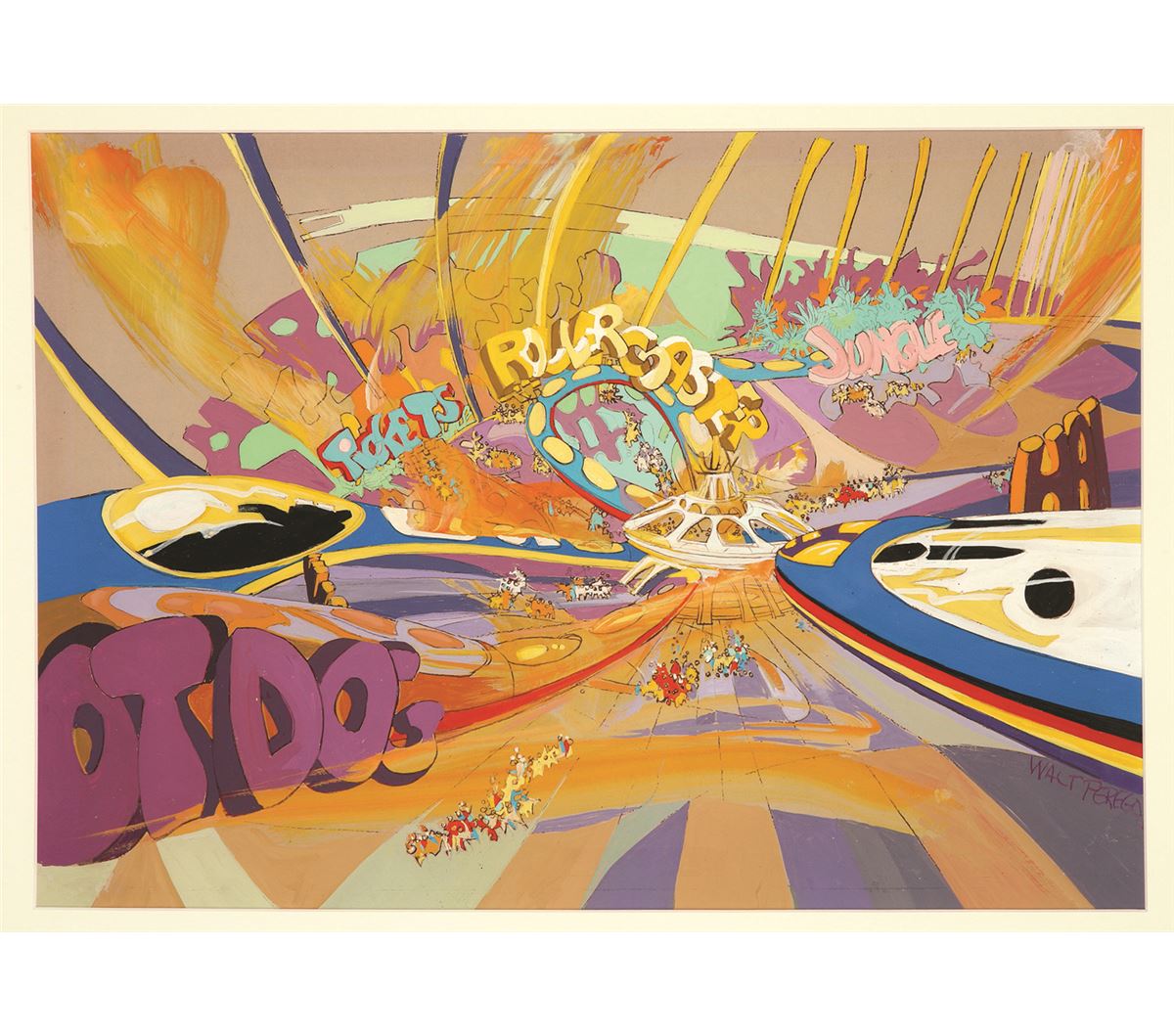 (Walt Disney World, 1977) Signed Walt Peregoy early original concept painting for EPCOT. After working as a background artist at the studio from 1951-1964, he returned as an Imagineer in 1977 to offer his unique vision and style to the building of EPCOT. This framed 18”x12.5” painting features a monorail type vehicle heading towards a Space Mountain type structure. The artwork is signed in the lower right corner by Peregoy. In fine condition with very little wear. Unexamined out of frame.