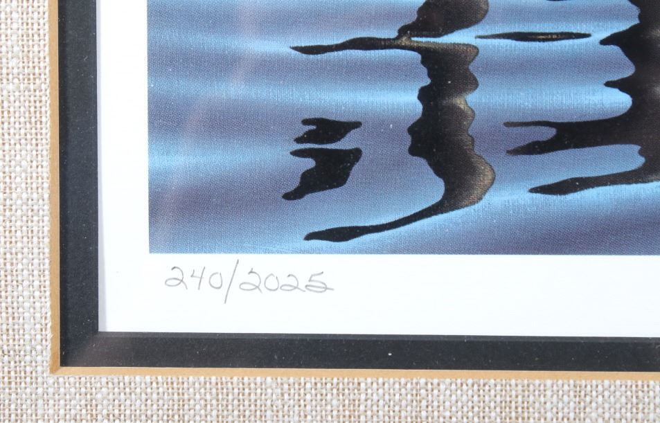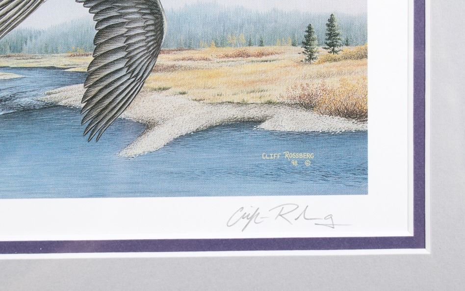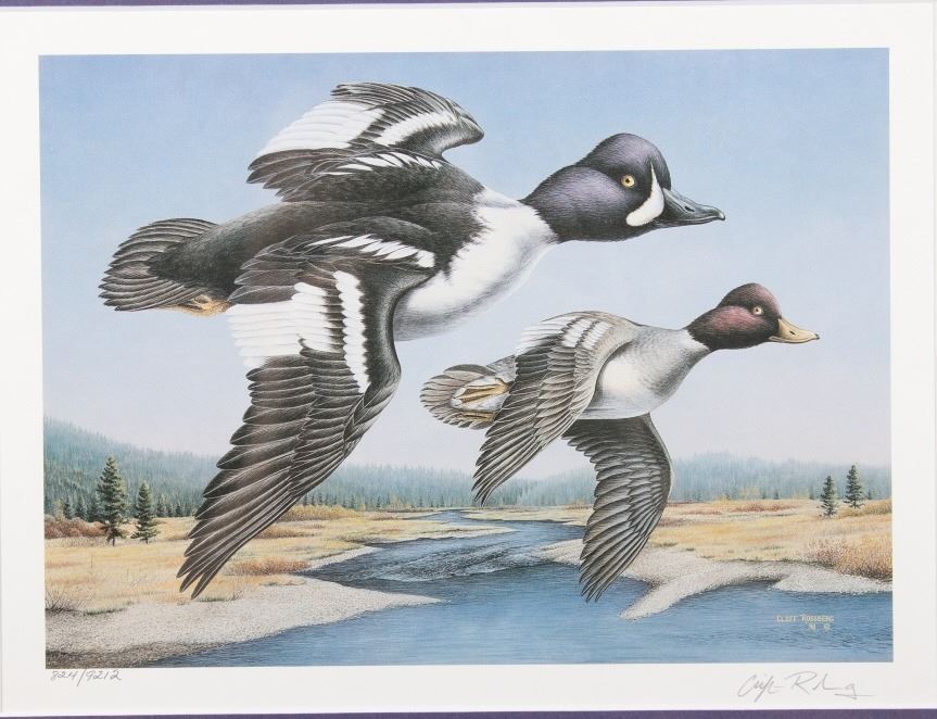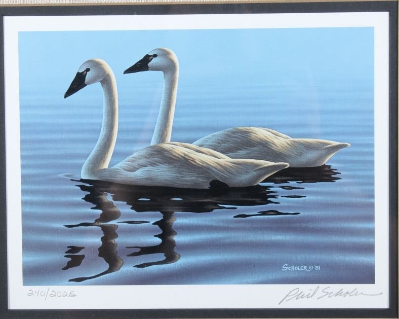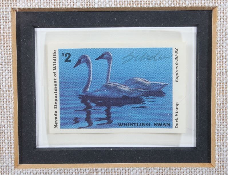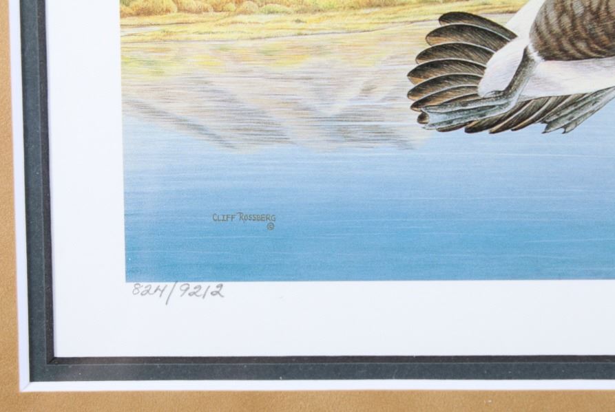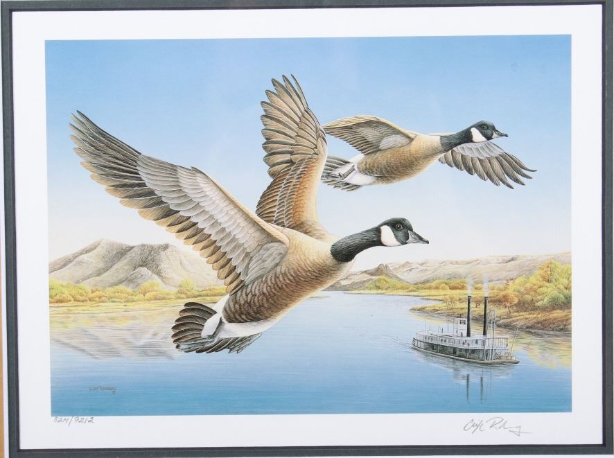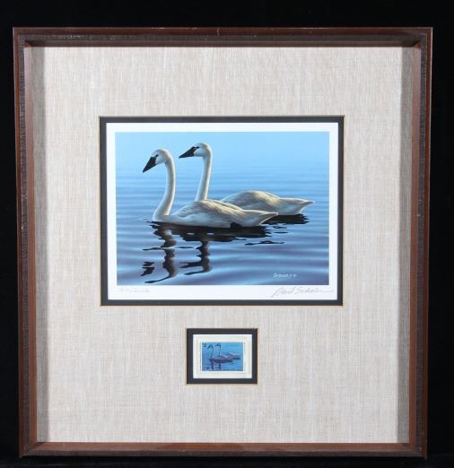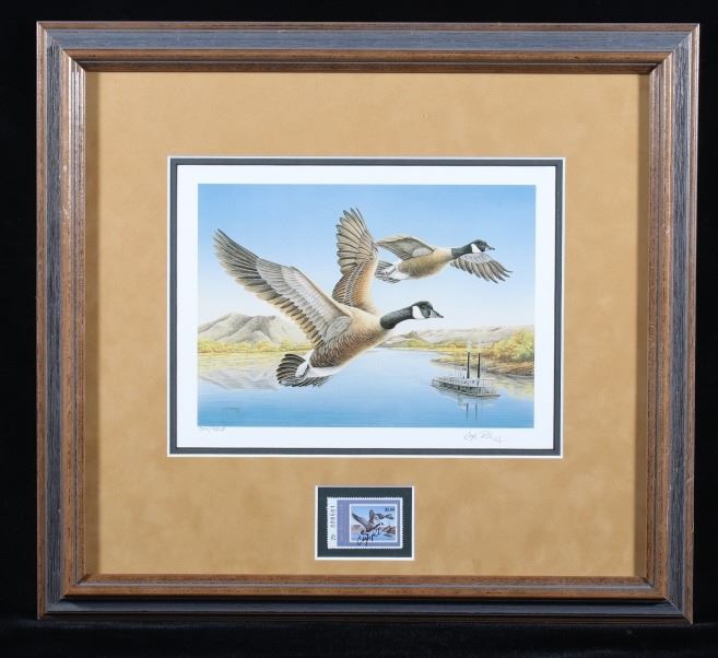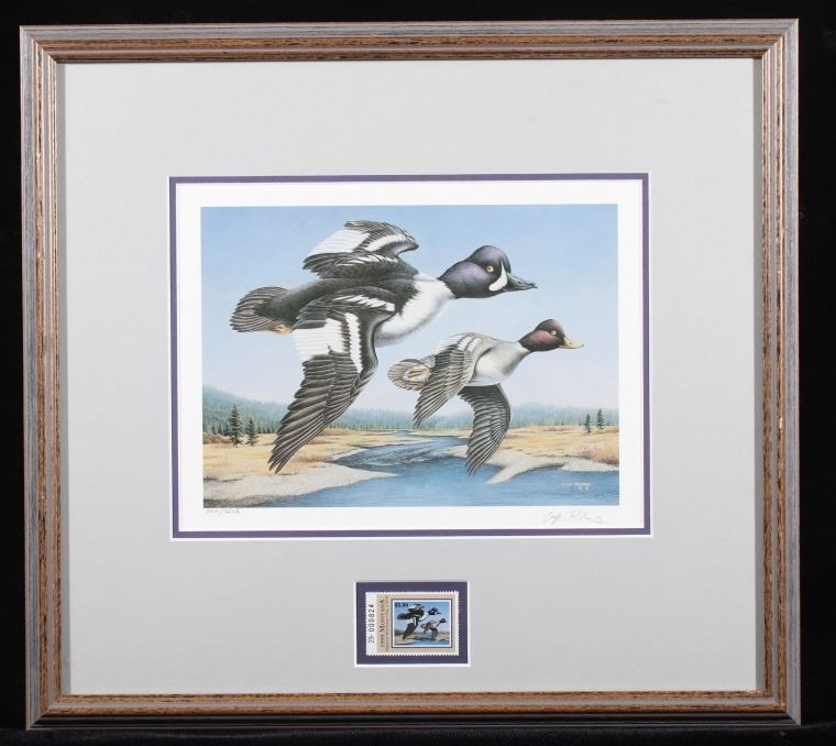 Featured in this lot we have a set of three framed paintings of water birds with their corresponding stamp originating from the 1980' to 1990's. Each framed piece shows a U.S. stamp that is part of one of the water and game bird collections along with a signed print of the original artwork on the stamp. The first of the pieces shows a pair of whistling swans swimming on calm water with their rippling reflections in the water. The piece is marked 240/2025 and is signed by Phil Scholer. The second piece shows a pair of Canada geese flying over a river with a old style steam boat on the water. The piece shows both the stamp and print signed by the artist. The third and final print shows a drake and hen pair of goldeneye ducks in flight over grassy plains with a river running through the center. Both the Canada geese and Goldeneye duck pieces are signed by Cliff M. Roseburg and are marked "824/9212" with the stamps all numbered "29-000824". The pieces are set into nice wooden frames with brown of tan borders around the art and stamps and are marked "824/9212" with the stamps all numbered "29-000824". The pieces are set into nice wooden frames with brown, grey, and off-white borders around the art and stamps. The prints and stamps show good condition overall with some light wear on the frames. The first frame measures 17 1/2" wide by 18 1/4" tall with the art measuring 9 3/4" wide by 7 1/2" tall.
