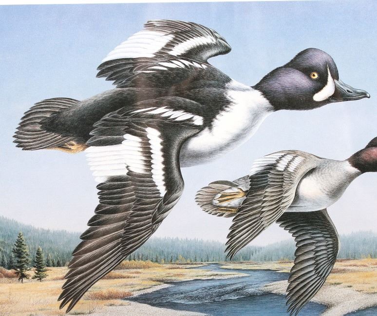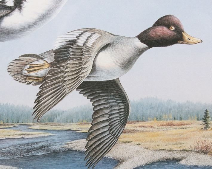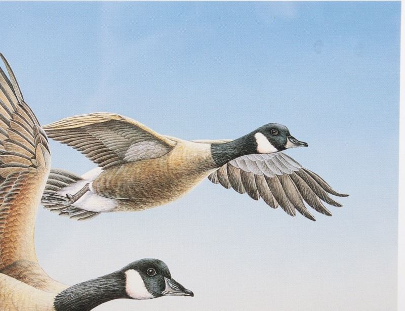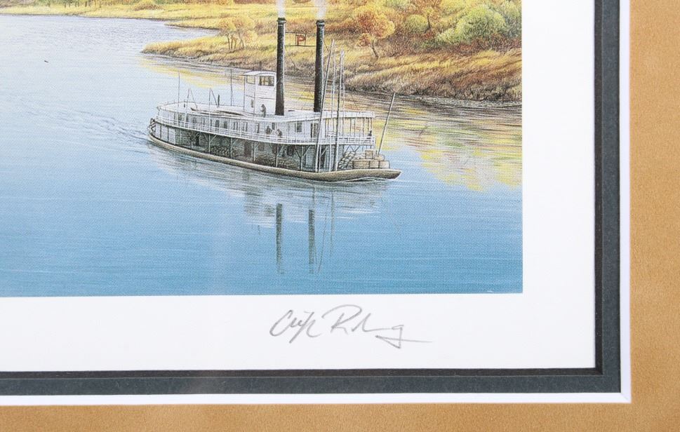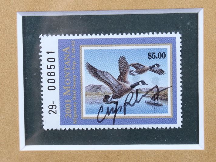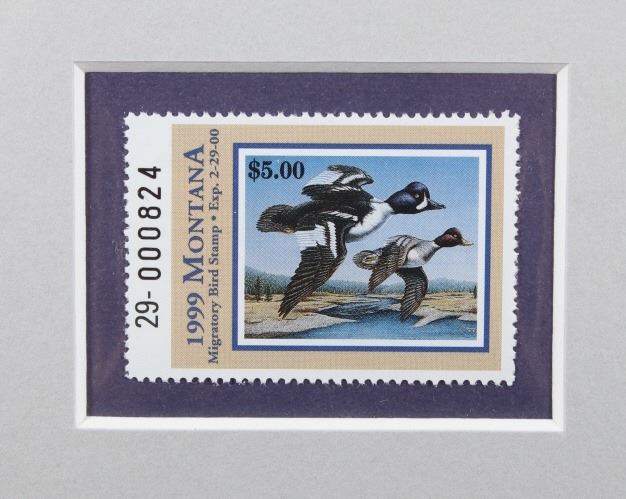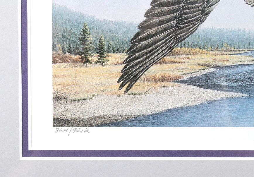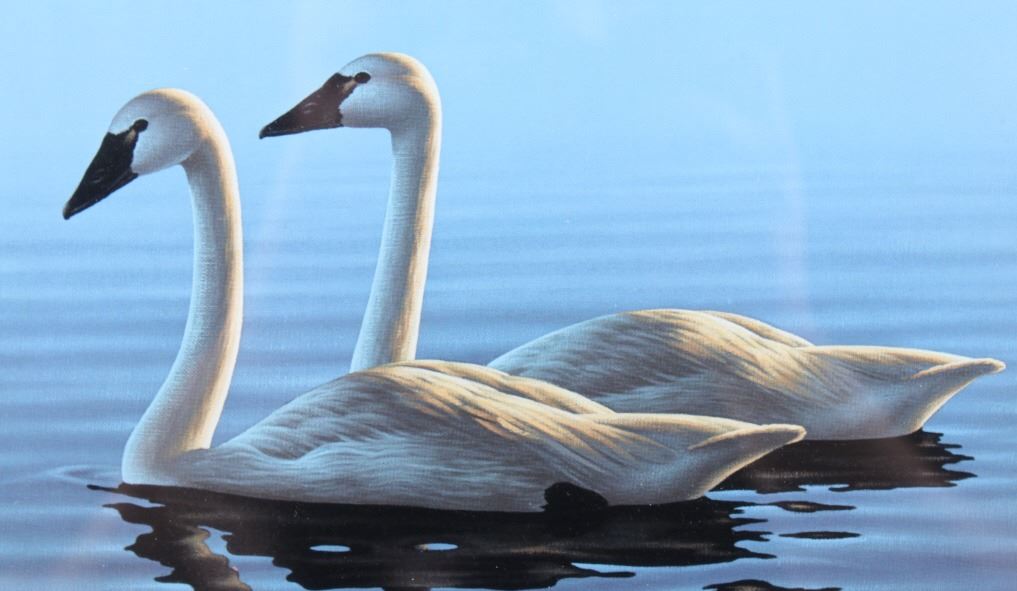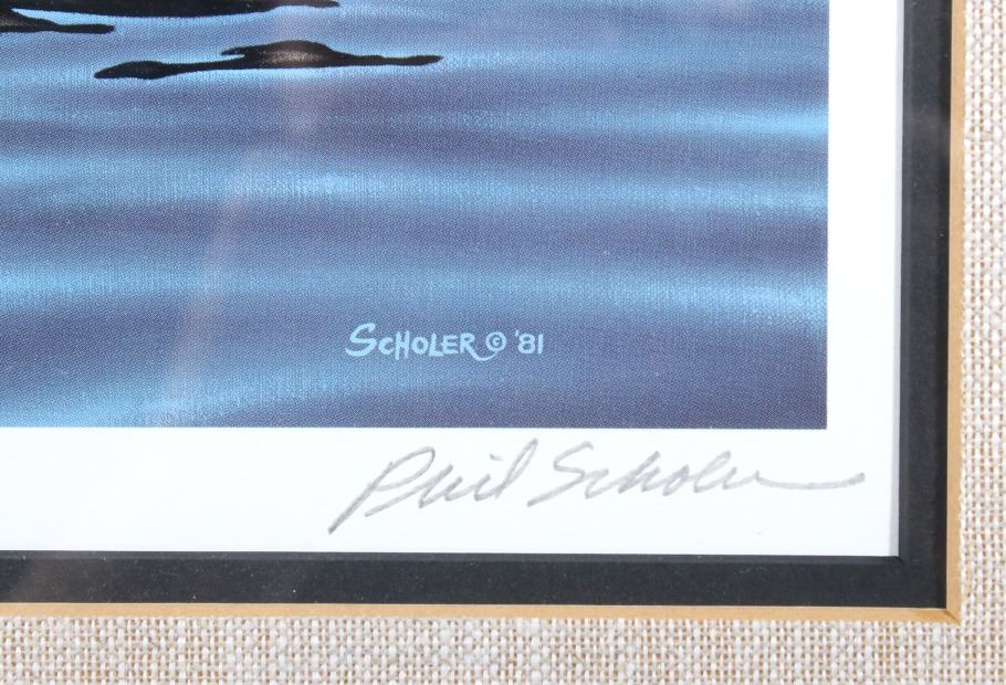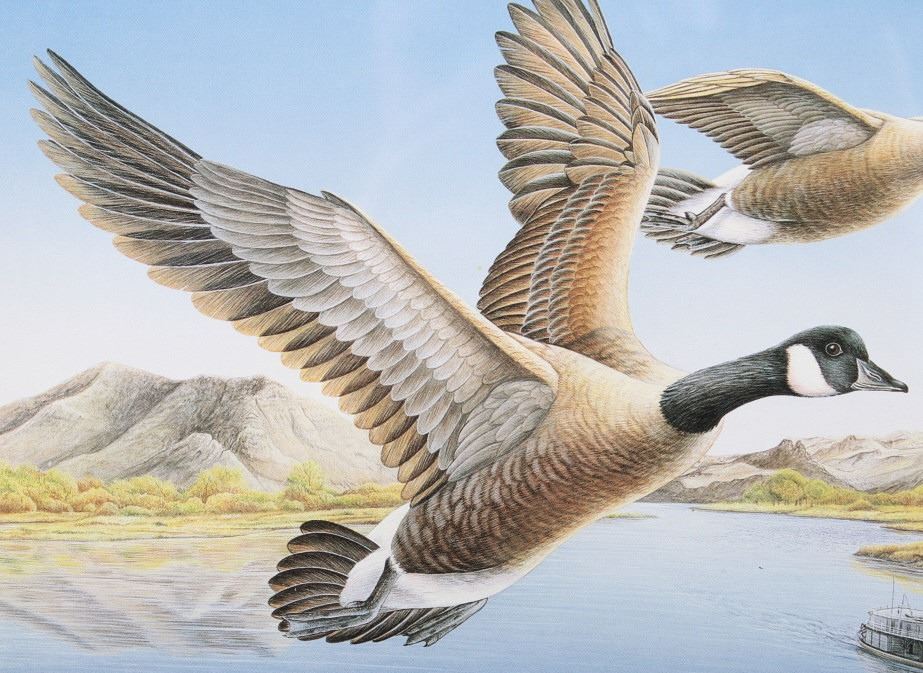 Featured in this lot we have a set of three framed paintings of water birds with their corresponding stamp originating from the 1980' to 1990's. Each framed piece shows a U.S. stamp that is part of one of the water and game bird collections along with a signed print of the original artwork on the stamp. The first of the pieces shows a pair of whistling swans swimming on calm water with their rippling reflections in the water. The piece is marked 240/2025 and is signed by Phil Scholer. The second piece shows a pair of Canada geese flying over a river with a old style steam boat on the water. The piece shows both the stamp and print signed by the artist. The third and final print shows a drake and hen pair of goldeneye ducks in flight over grassy plains with a river running through the center. Both the Canada geese and Goldeneye duck pieces are signed by Cliff M. Roseburg and are marked "824/9212" with the stamps all numbered "29-000824". The pieces are set into nice wooden frames with brown of tan borders around the art and stamps and are marked "824/9212" with the stamps all numbered "29-000824". The pieces are set into nice wooden frames with brown, grey, and off-white borders around the art and stamps. The prints and stamps show good condition overall with some light wear on the frames. The first frame measures 17 1/2" wide by 18 1/4" tall with the art measuring 9 3/4" wide by 7 1/2" tall.